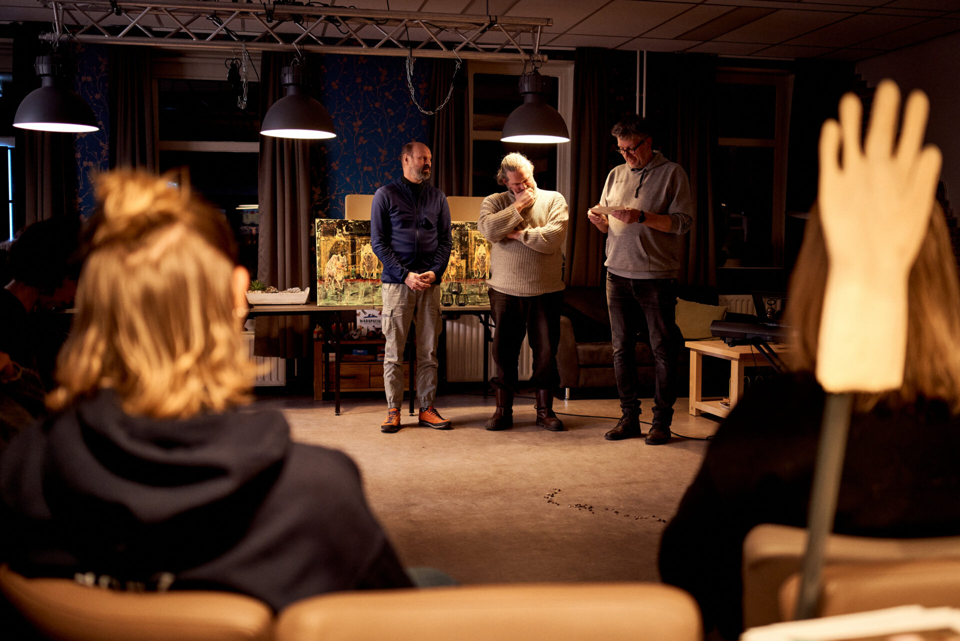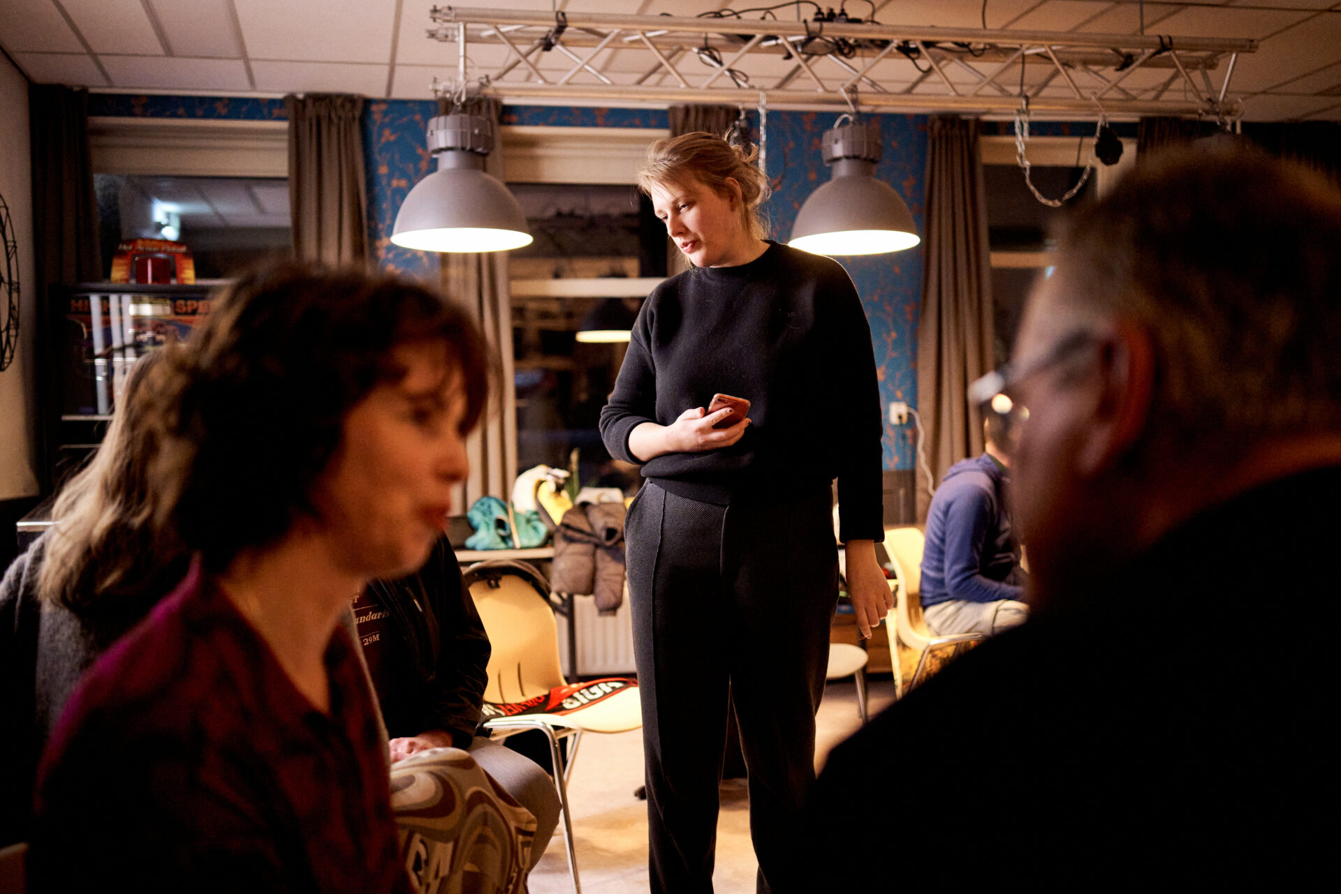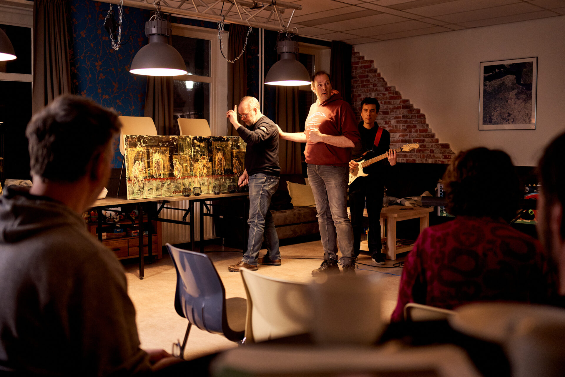 Voor deze eerste creatieve werkplaats zijn we te gast in Dorpshuis Nieuw Calvaria in Roodeschool. De avond wordt geleid door theatermaker Sara Scholten en Jordy Richir, bandcoach van de Rijdende Popschool. Zij leggen het doel van deze bijeenkomst uit: we doen een creatief vooronderzoek voor de Gronings Vuur voorstelling in Het Hogeland. Deelnemers van deze werkplaats gaan bedenken hoe de verhalen die bij hen leven creatief vertaald kunnen worden in verrassende presentaties.