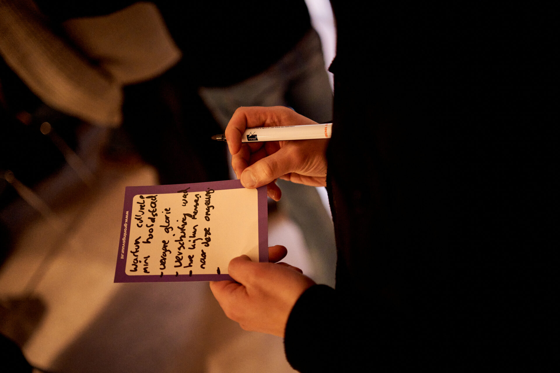 Sara geeft iedereen de opdracht om twee minuten te speeddaten met elkaar. Er wordt volop gespeculeerd, gediscussieerd en nagedacht. Nadat iedereen met elkaar in gesprek is geweest, worden de ideeën gedeeld.