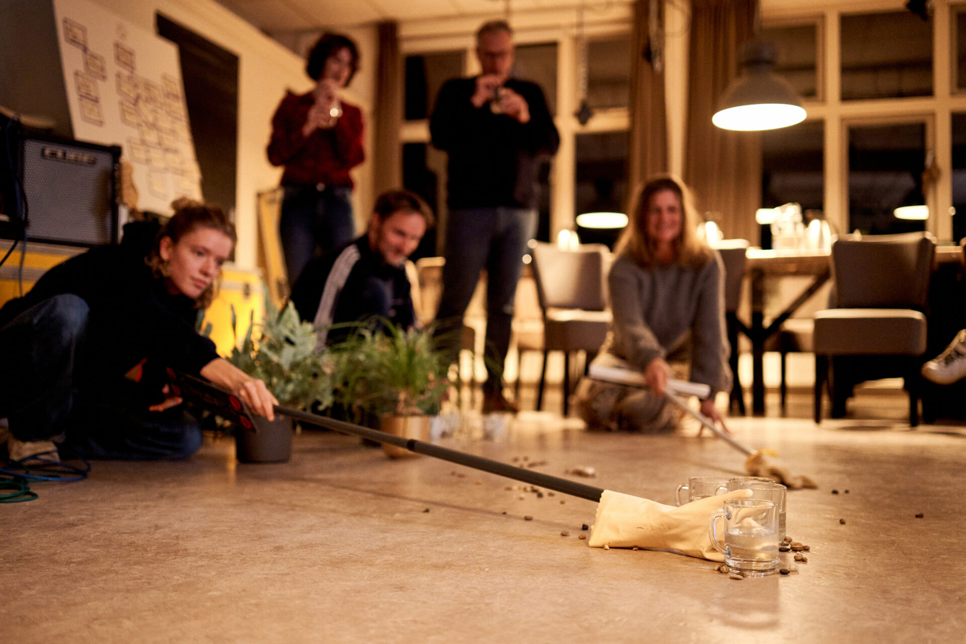 De derde groep gooit het over een andere boeg. Er is een serieus plan van de inwoners in Roodeschool om het water terug te brengen naar dit gebied, Het Hogeland. Om recreatie te bevorderen, water vast te houden en af te voeren, en om verzilting tegen te gaan. Dit idee verbeelden ze met elkaar. Op de grond staan planten, en er liggen steentjes, als verbeelding van het land. Op de achtergrond is kabbelend water te horen en een melodie van slagwerk op kopjes en glazen. ‘Onzichtbare’ handen sturen en duwen glazen met water het land op.