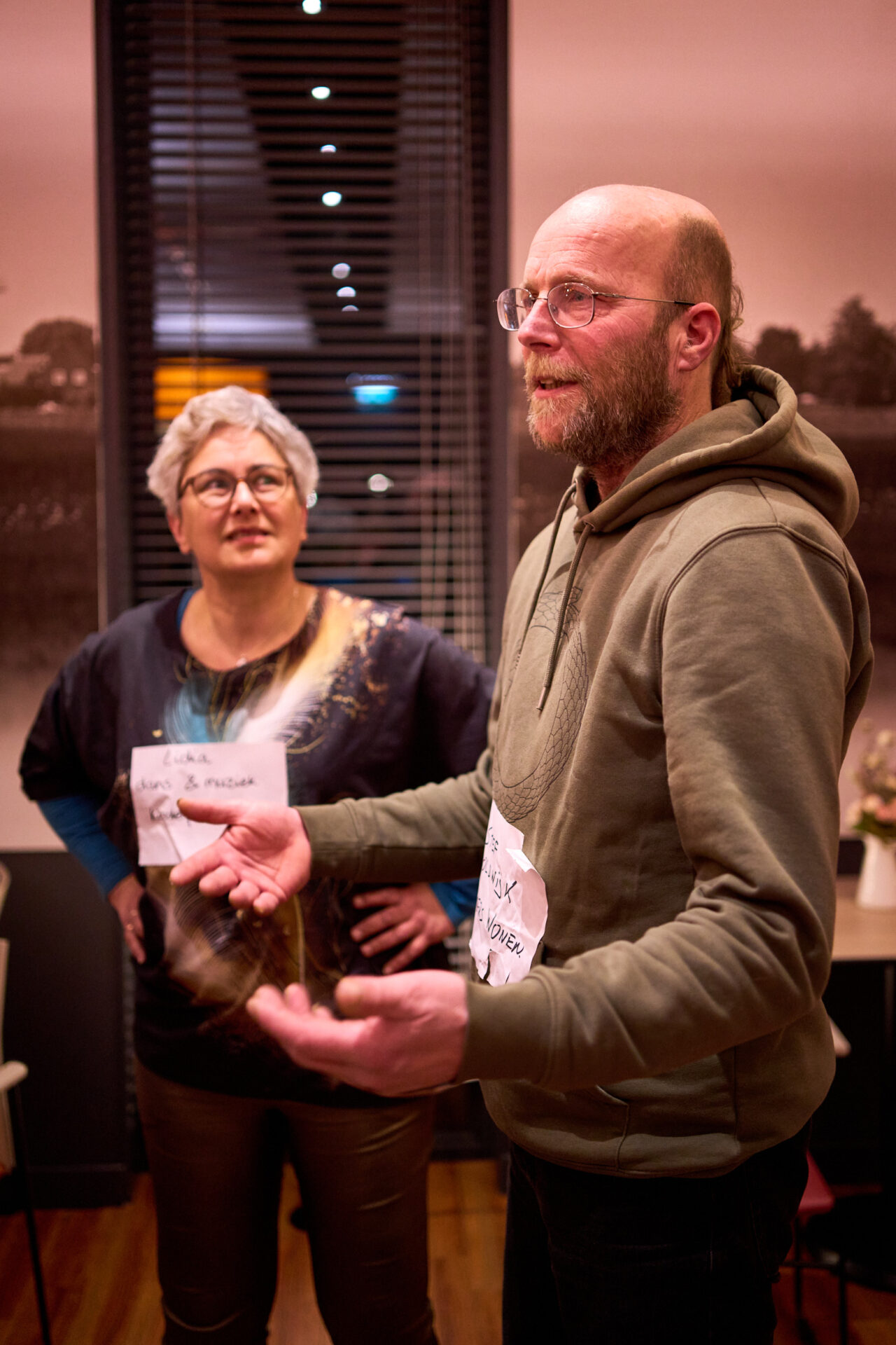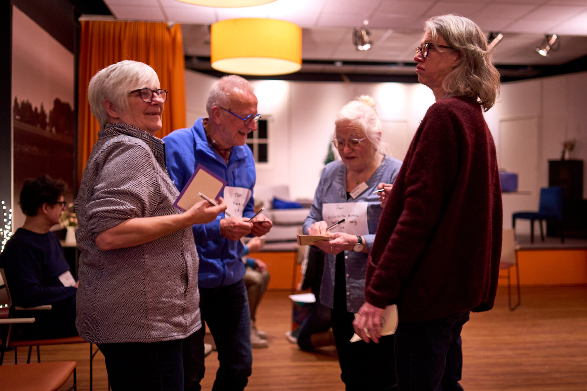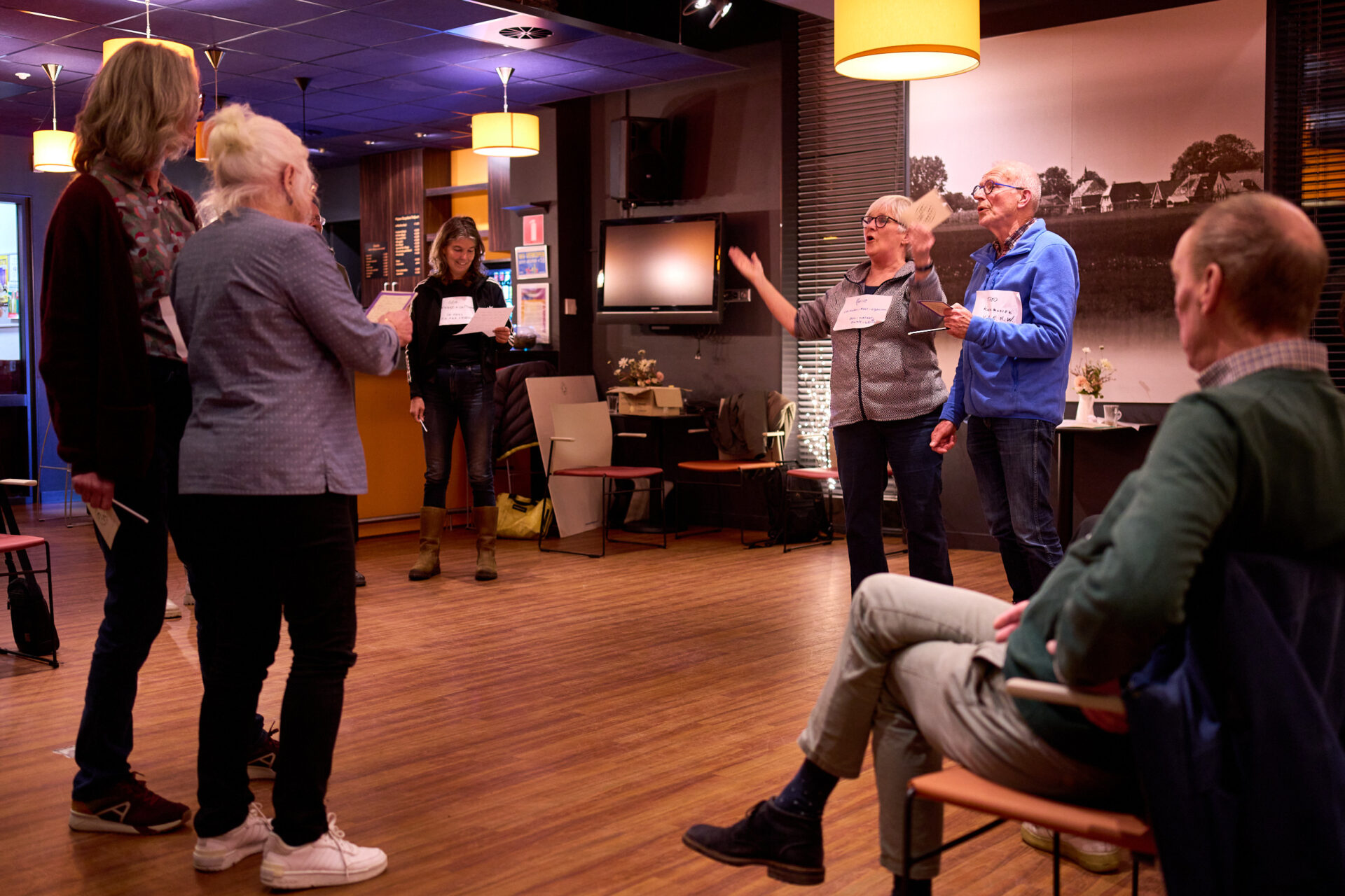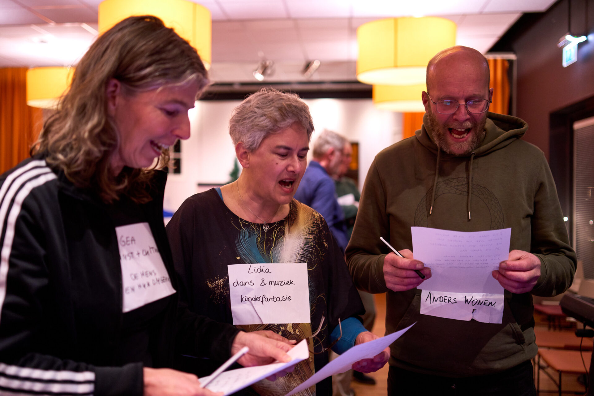Wat volgt is een zaal vol zang, muziek en gesprekken. Het lijkt een lastige opgave, maar na een klein half uur is iedereen klaar. Sara: ,,Als afsluiting van deze avond laten we aan elkaar zien wat we hebben bedacht en gemaakt.”