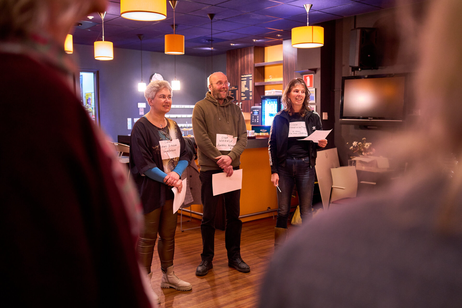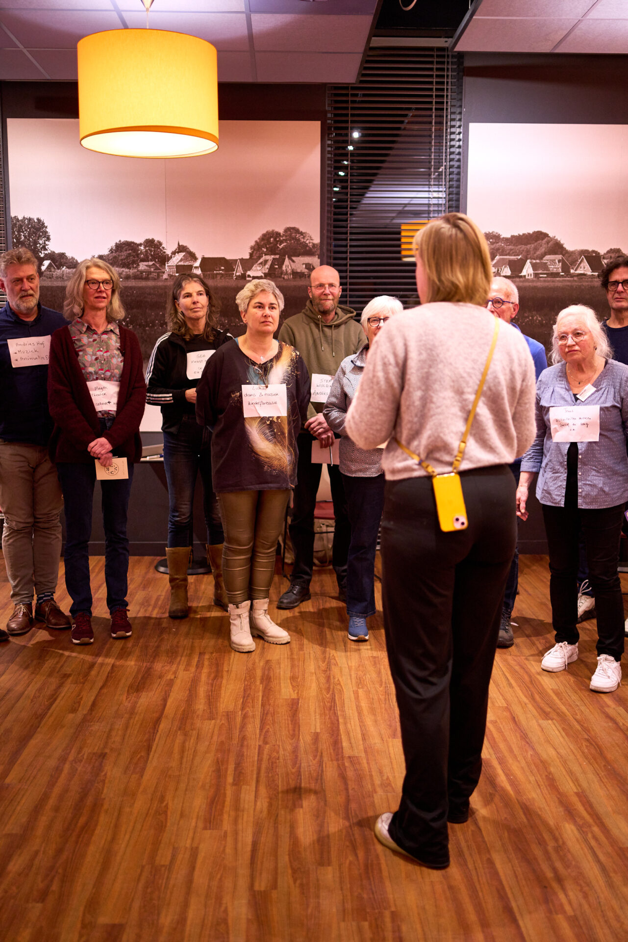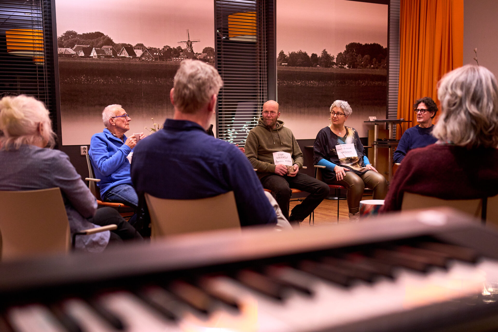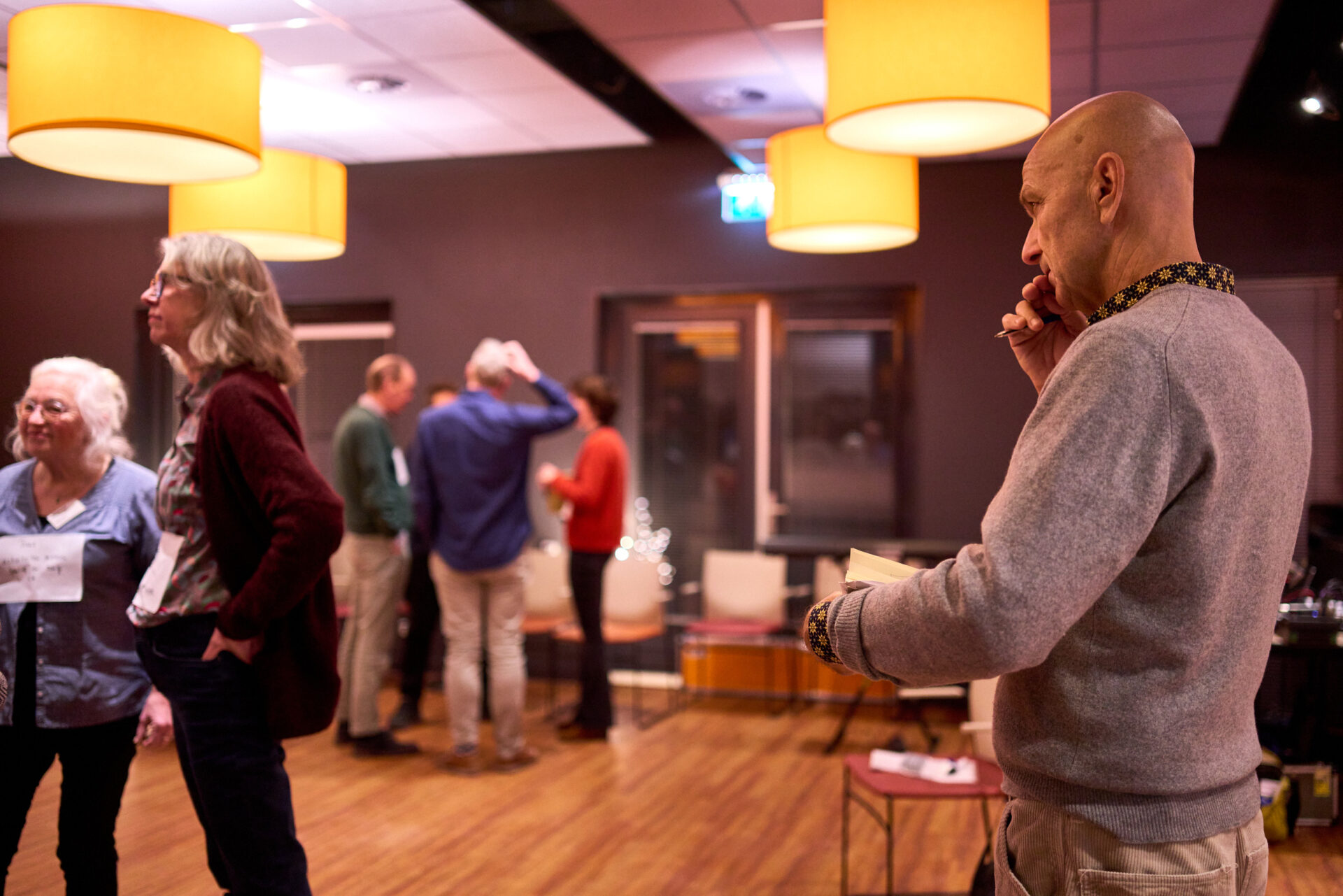 Wat volgt is een zaal vol zang, muziek en gesprekken. Het lijkt een lastige opgave, maar na een klein half uur is iedereen klaar. Sara: ,,Als afsluiting van deze avond laten we aan elkaar zien wat we hebben bedacht en gemaakt.”