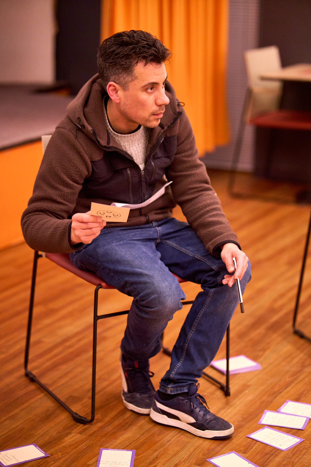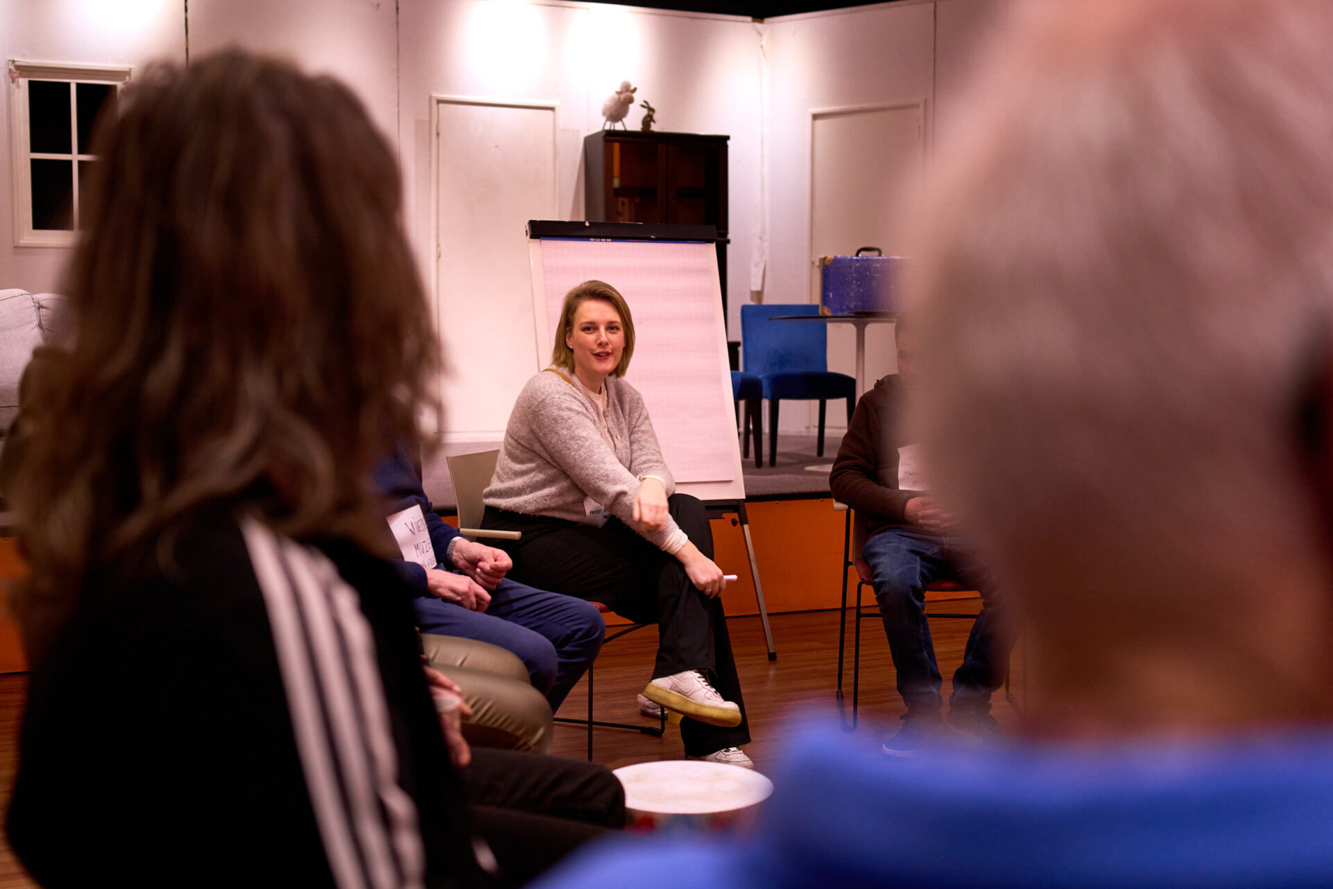 Jordy legt de werkwijze van vanavond uit: ,,We halen ook vanavond verhalen op, gaan daarmee op een creatieve manier aan de slag en presenteren het daarna kort, zodat we input kunnen geven aan Jos.”