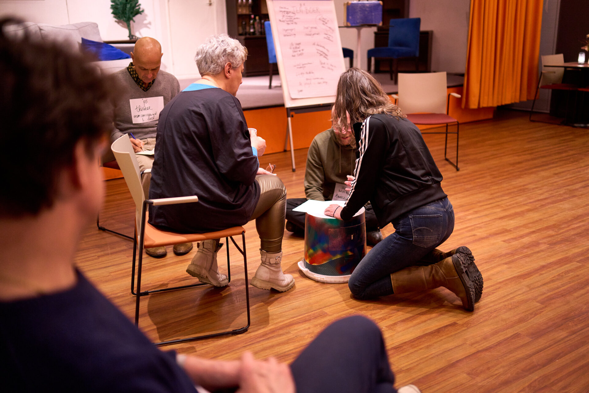 Uit deze korte verhalen worden de volgende concepten gekozen om aan door te werken in 3 groepen: een koor dat tegenover elkaar staat te zingen, wandelende mannetjes en de jeugd als tijdbom. Sara vraagt iedereen om groepen te vormen en vervolgens in twintig minuten het onderwerp uit te werken in een concept.
