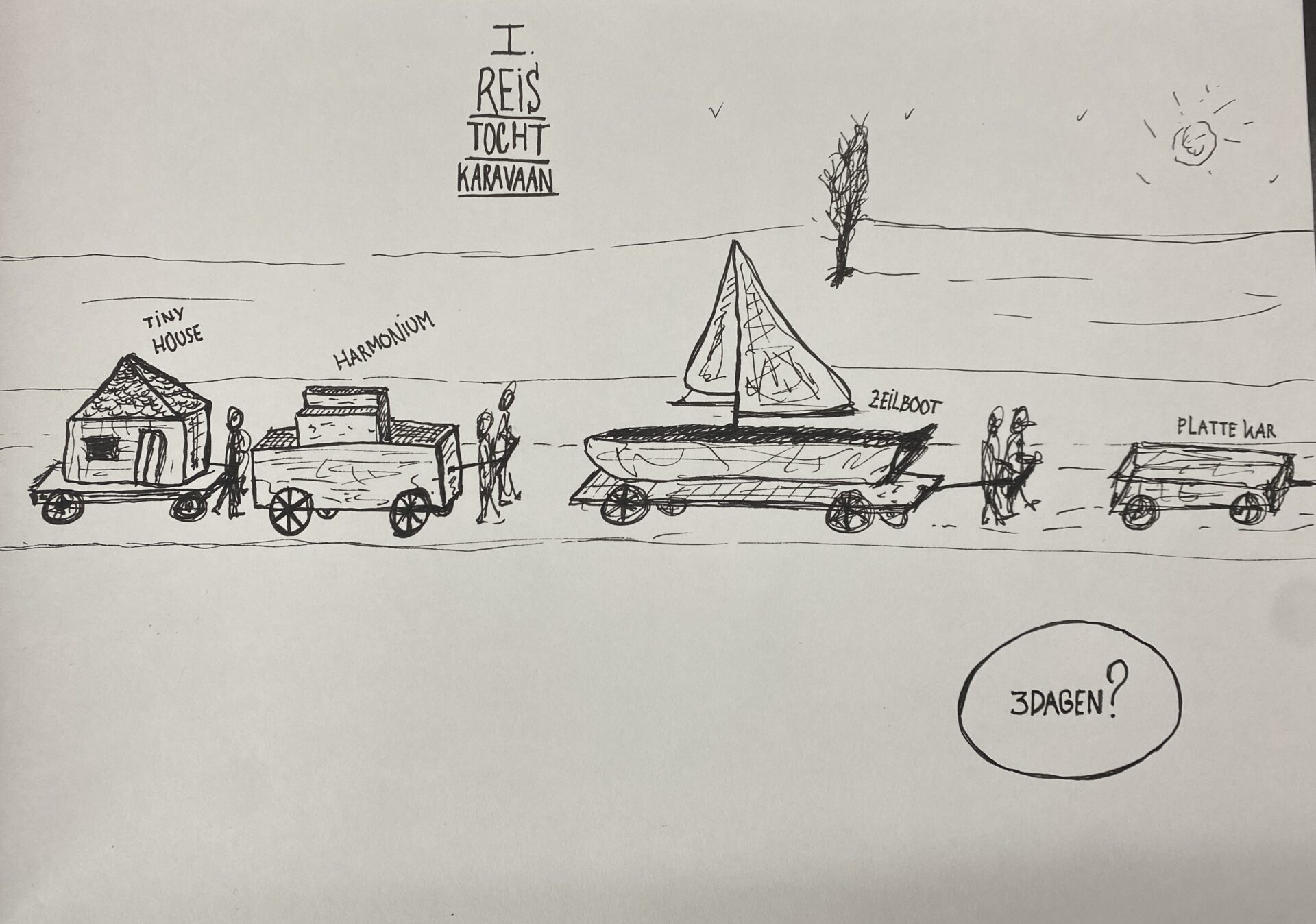 - I. De reis: een tocht, karavaan. We gaan gedurende een paar dagen onderweg: met grote wagens doen we verschillende dorpen aan. Met optredens, voordracht, dans, discussie en we bouwen aan de wagens. Deze vragen staan centraal: Wat hebben we niet meer nodig in de toekomst? Of juist wel? Wat geven we mee met de karavaan?