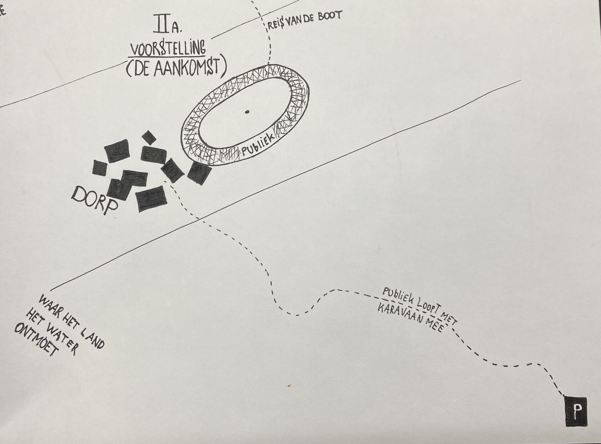 - IIa Voorstelling (De aankomst), publiek loopt mee met de karavaan van wagens en komt aan in ‘het dorp van de toekomst’. Daar is van alles gebouwd. Zelfgebouwde huizen aan het water, waar mensen naar binnen kunnen om optredens te zien, te eten of met elkaar te debatteren. Bart zou graag zien dat dit dorp gebouwd wordt door kinderen, jongeren en jong volwassenen. Een groots plan, maar daar begint alles mee.