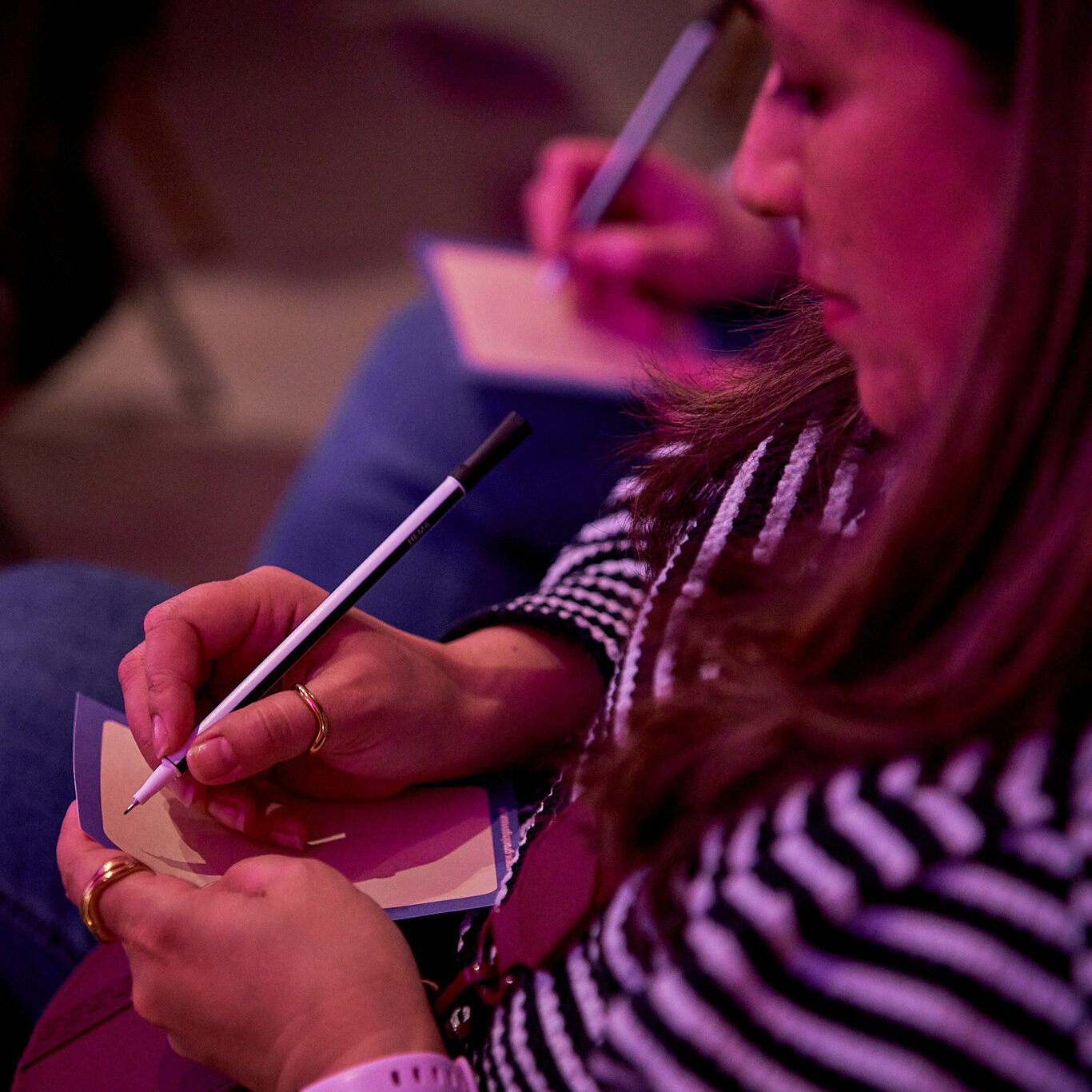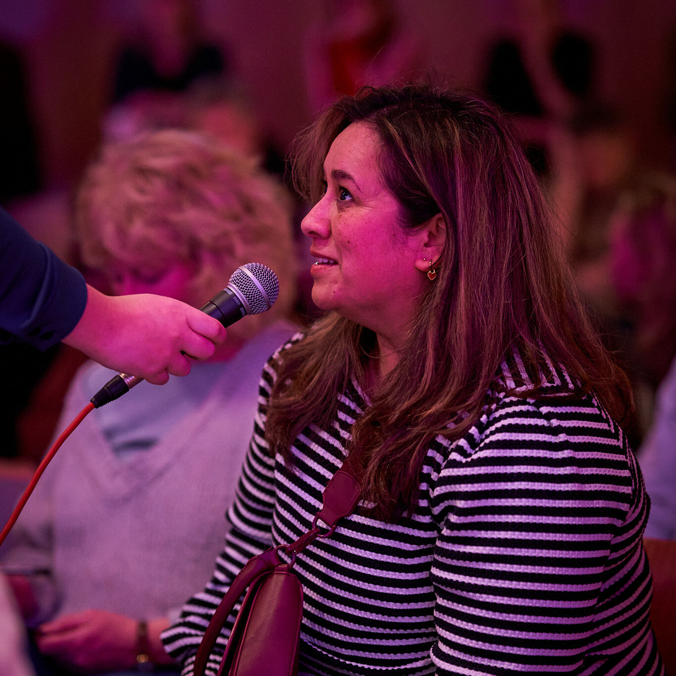 Sara vraagt het publiek om te reageren op verschillende stellingen;