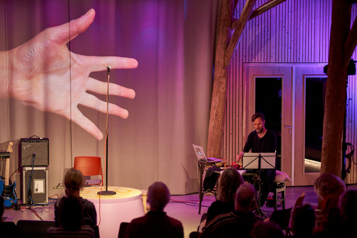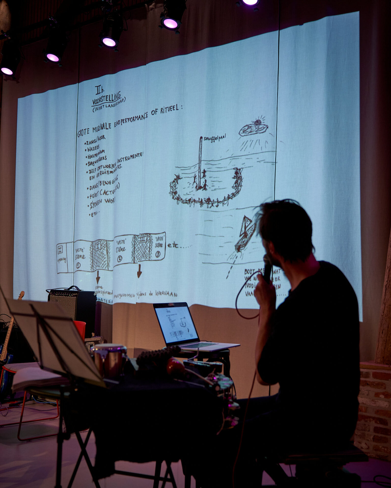 Daarna is het de beurt aan Bart de Vrees, de artistiek projectleider onder wiens verantwoordelijkheid de voorstelling in september wordt gemaakt. Hij leidt zijn gedeelte in met een muziekstuk, geschreven en uitgevoerd door hemzelf, ondersteund door beeld.