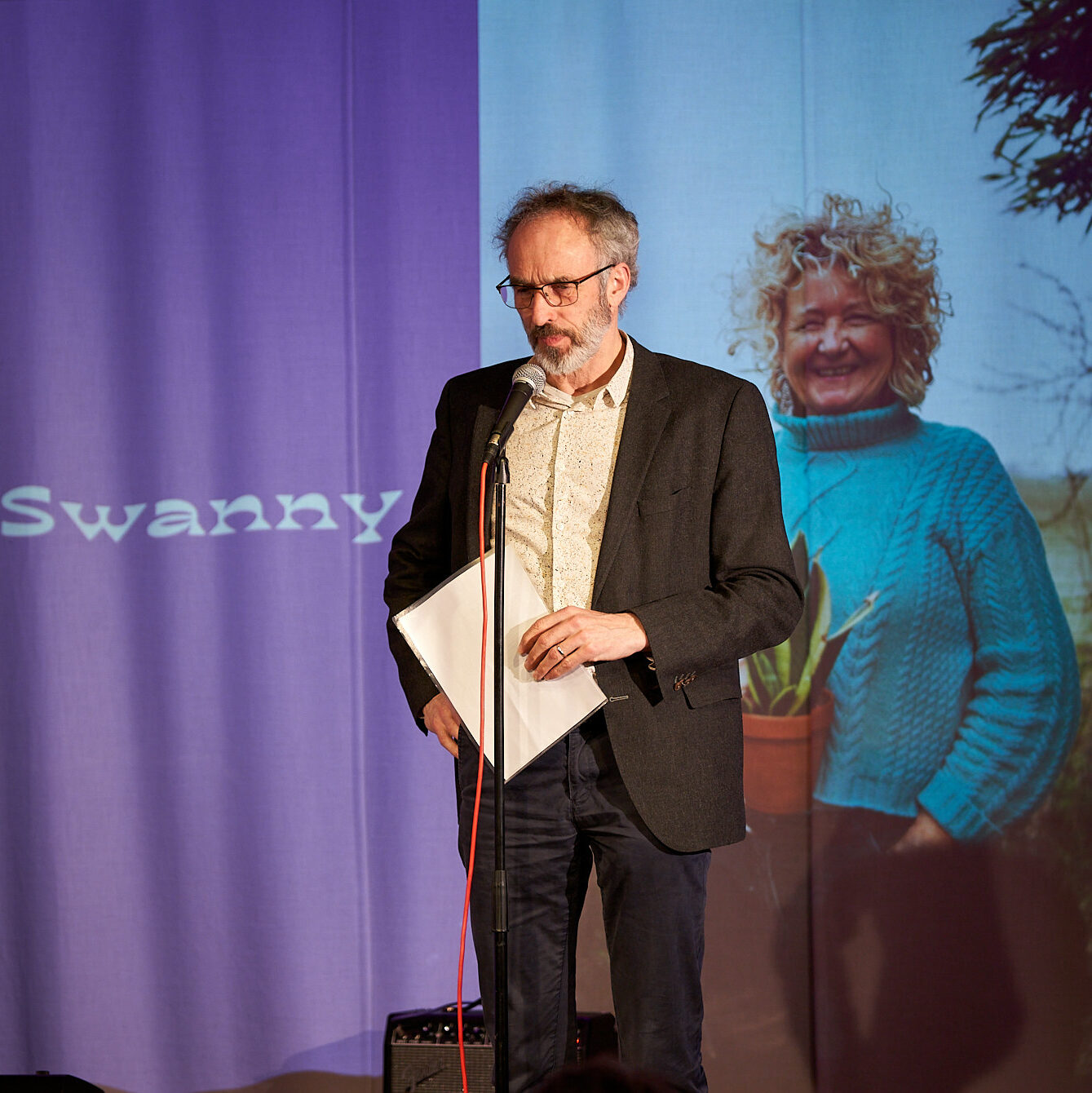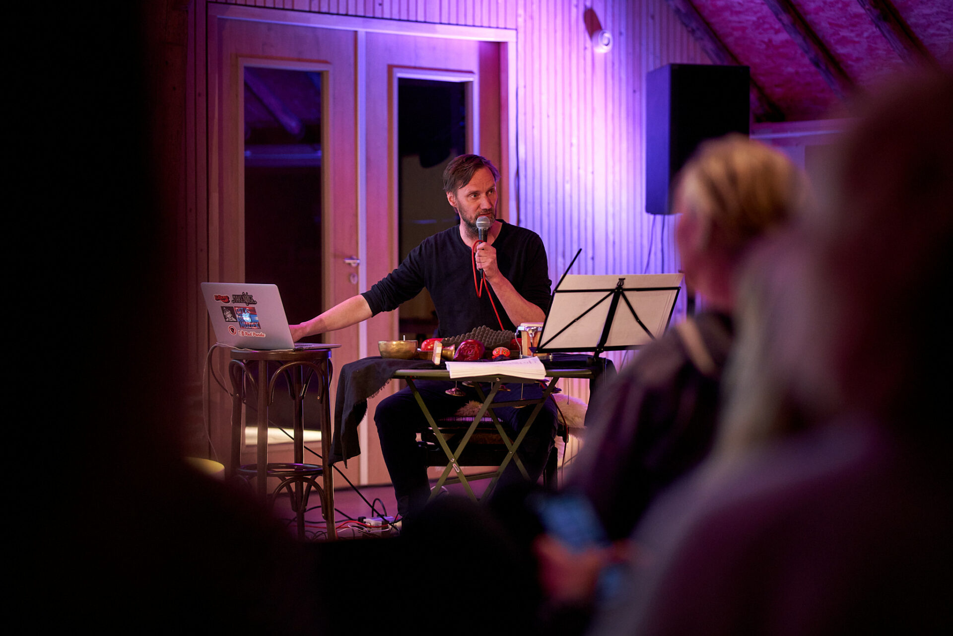 De eerste verteller van deze avond betreedt het podium: schrijver Willem Tjebbe Oostenbrink. Hij leest het gedicht voor dat hij schreef naar aanleiding van het interview met Swanny Beukema, oprichtster van Dasjagoud. Een gedicht over gemeenschap, de minsken, ’t laand, Grunnegs proaten en aan de proat roaken met mekoar.