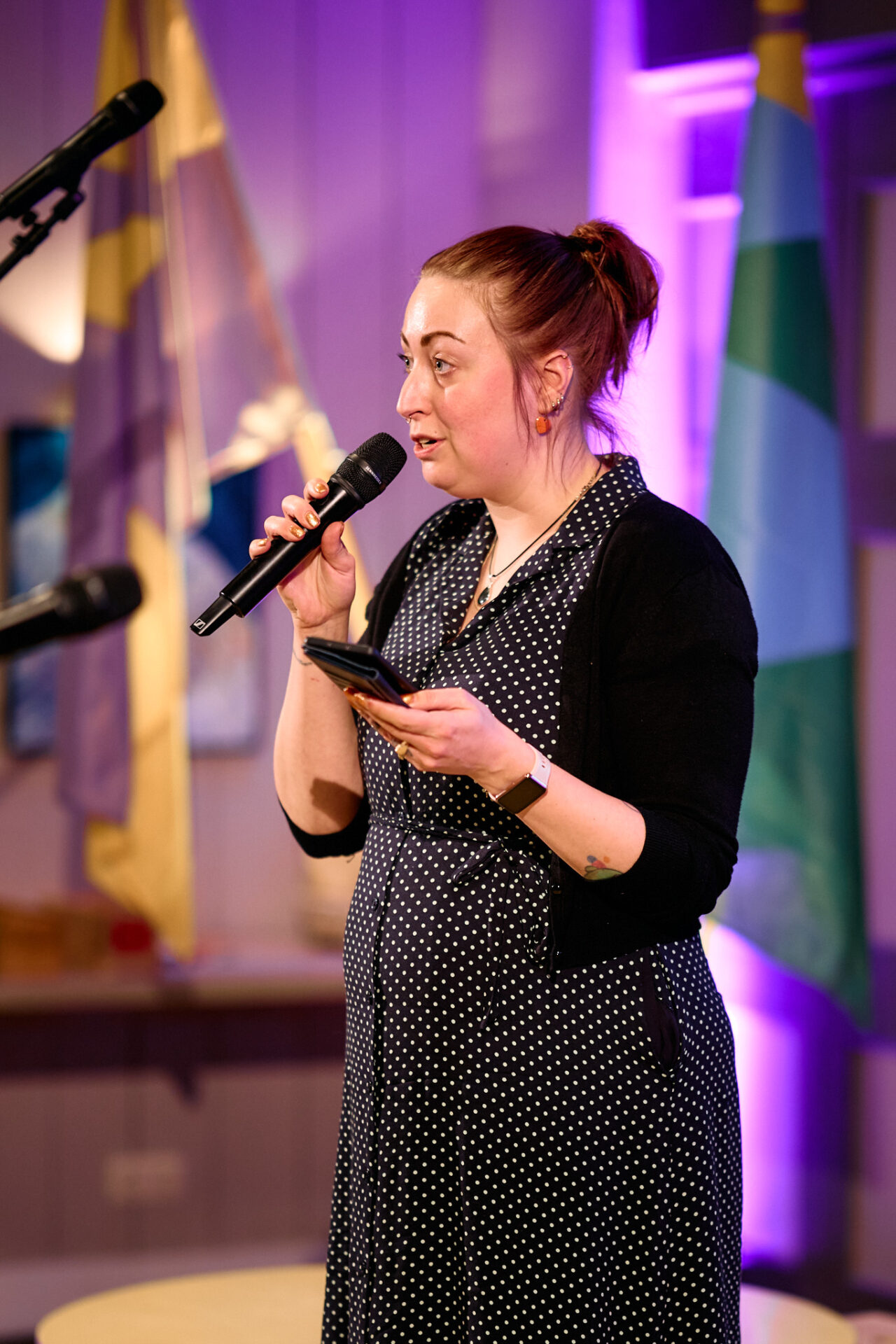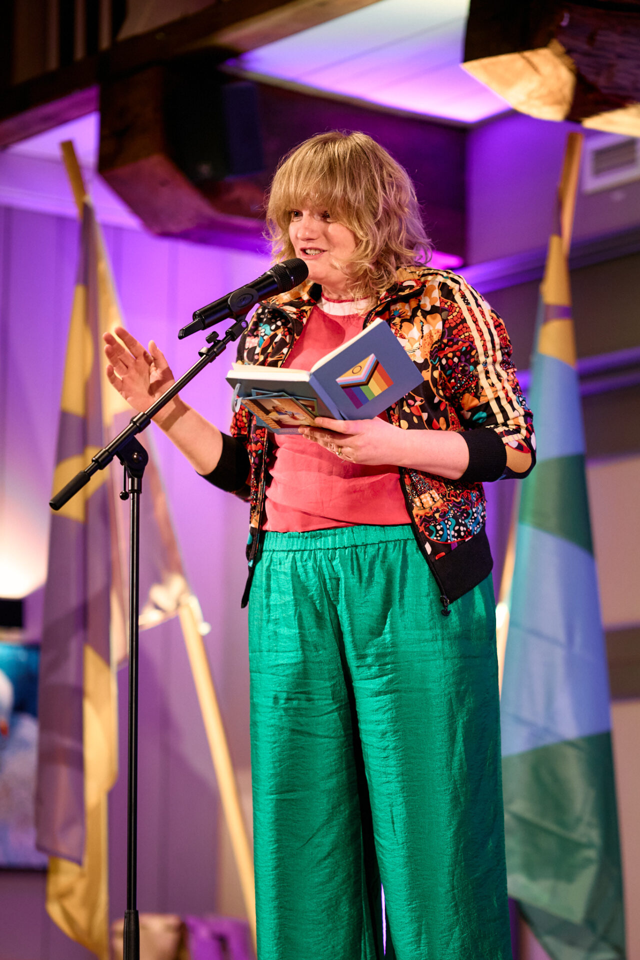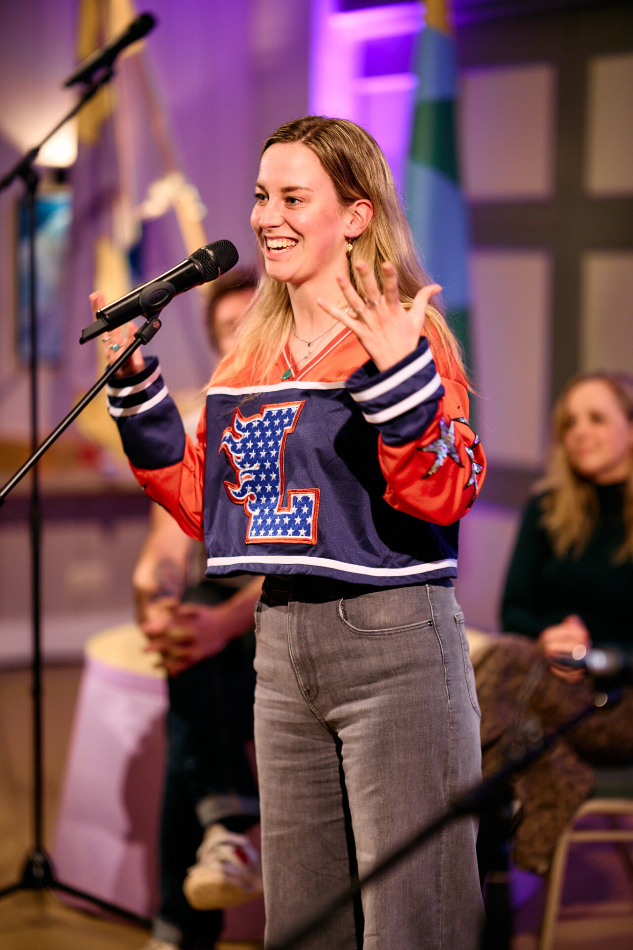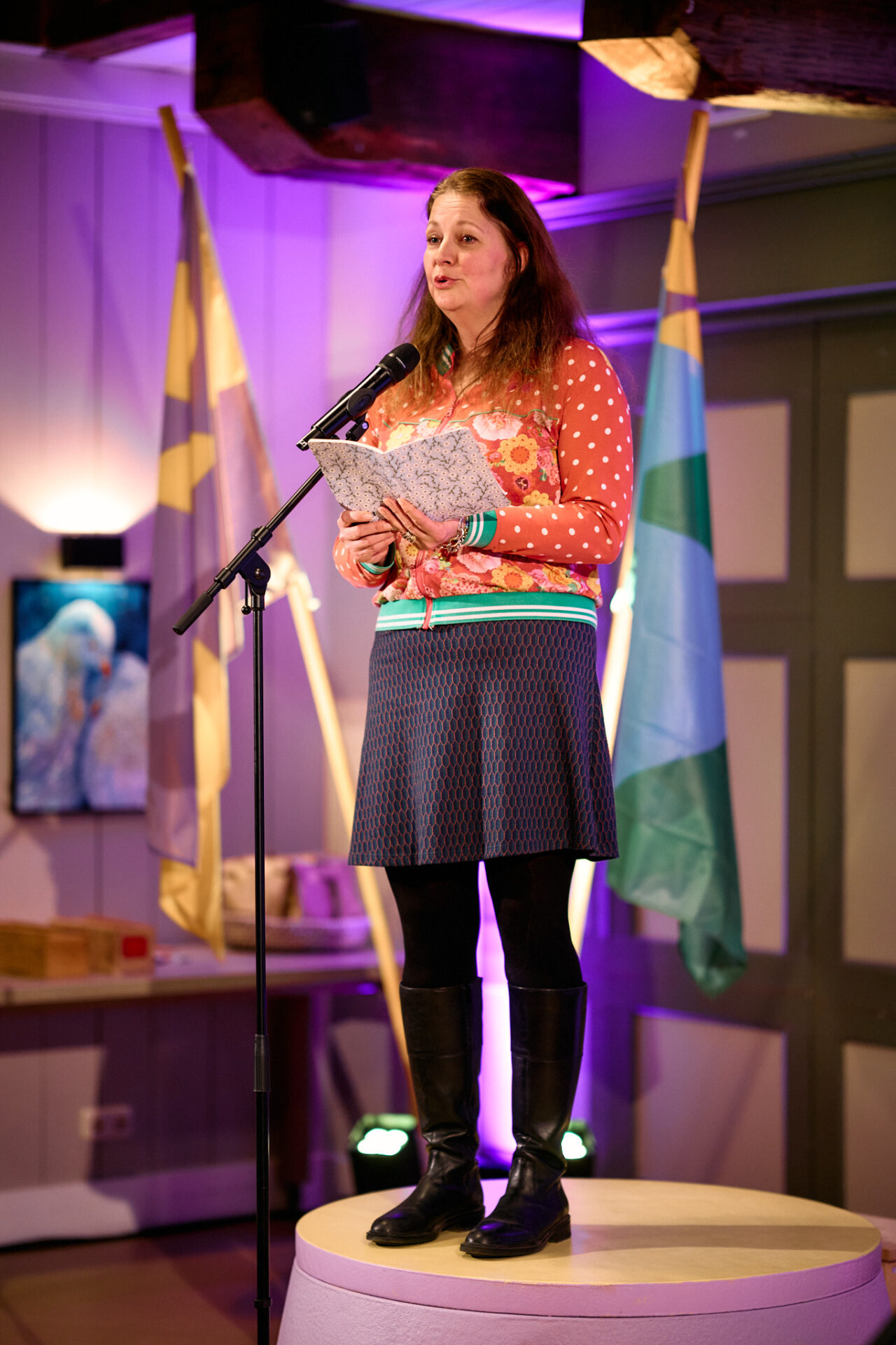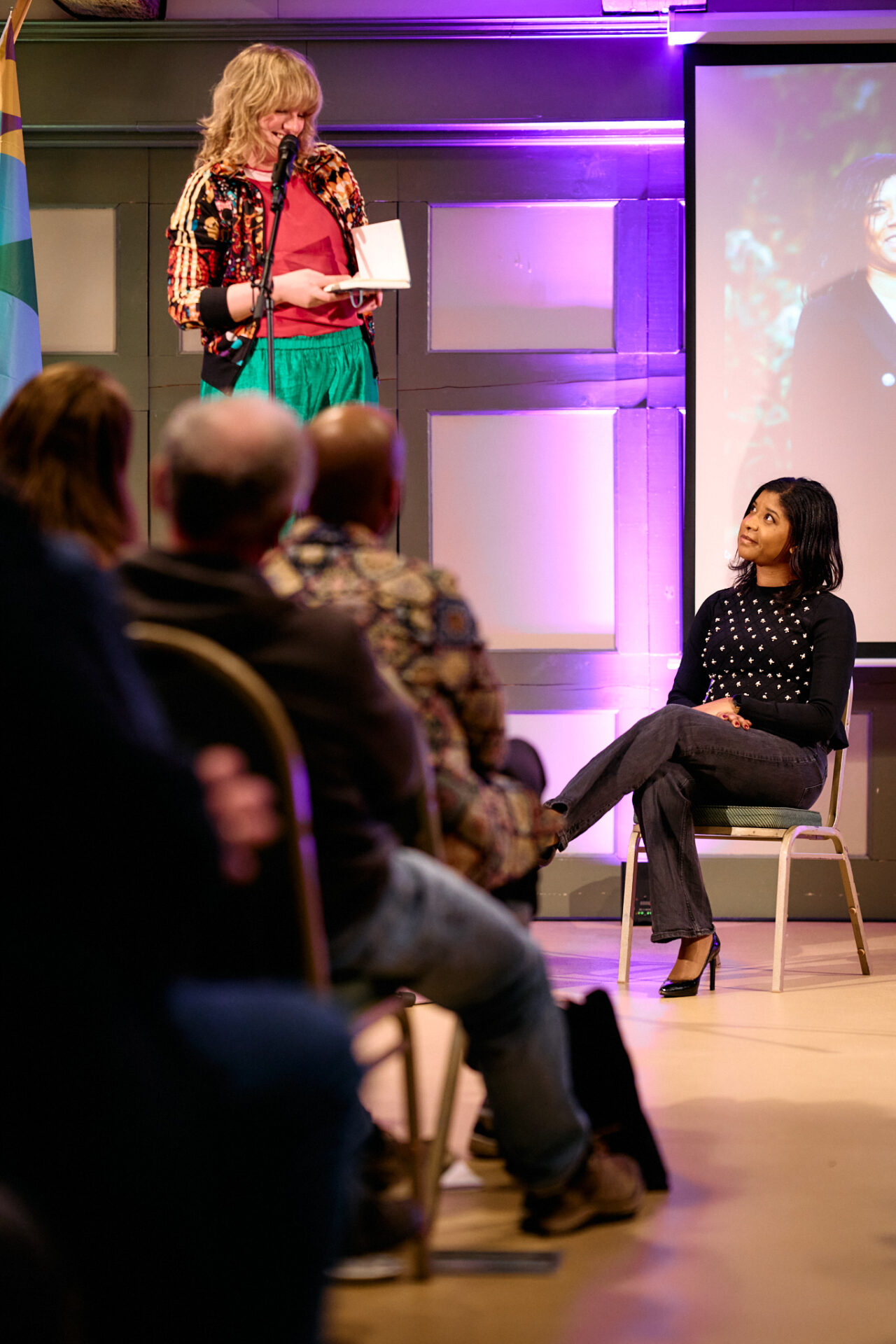 Zangeres T A M A R opent de avond op muzikale wijze. ,,Ik woon hier sinds 2021, en dacht: ik hoor hier helemaal niet. Kom uit Lewenborg en voel mij hier nog een beetje ontheemd. Ga ik hier ooit nog landen? Maar misschien heb ik me altijd al zo gevoeld!” Ze laat heel passend een liedje dat ze gemaakt heeft over ‘ontheemd zijn’ horen.