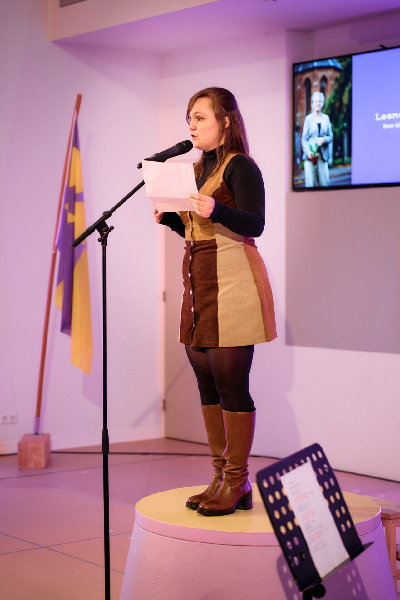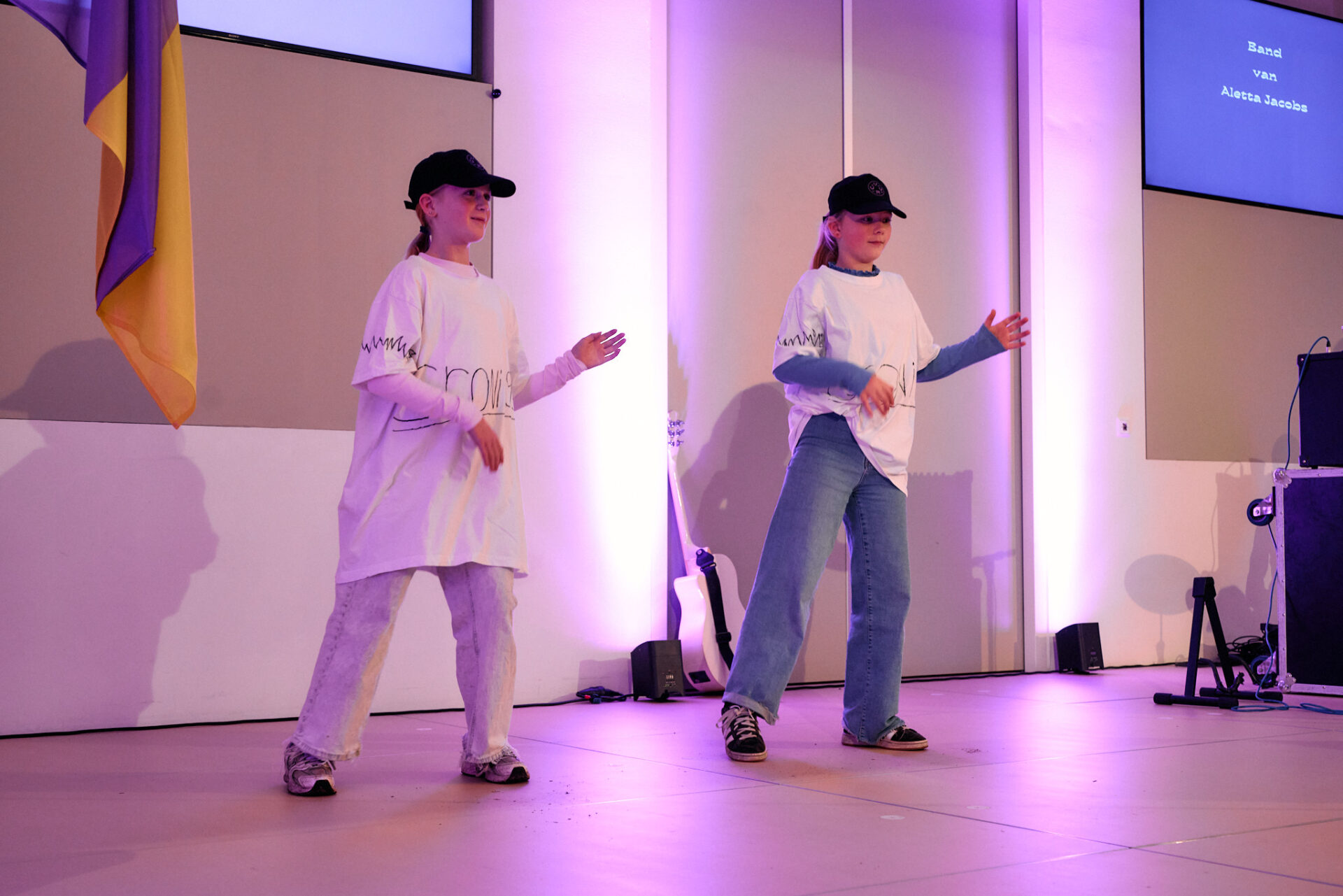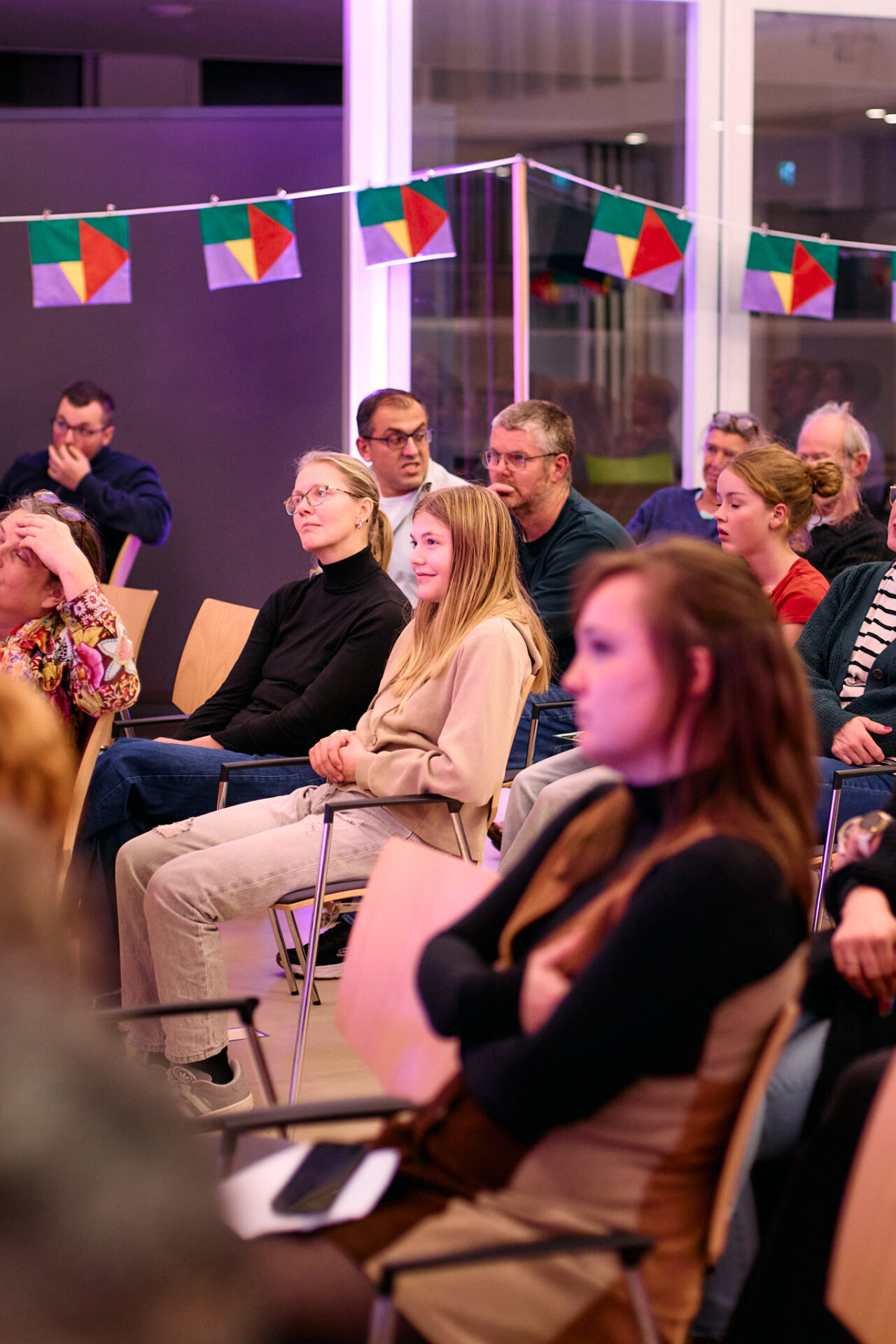 Na de pauze is het de beurt aan leerlingen van het dr. Aletta Jacobs College. Zij vormen voor de gelegenheid een band, die ontstond na workshops vanuit Gronings Vuur op hun school. Vijf muzikanten en twee uiterst vrolijke dansers komen op het podium. ,,Wij willen blijven in dit stuk land” en ,,Reik onze jongeren toch de hand”, zijn delen uit het lied dat ze opvoeren. Ze zeggen ‘weg, weg, weg tegen het saaie Grunn’, en opteren voor een gamehal en levendiger centrum en willen ook hun eigen thuis bouwen.