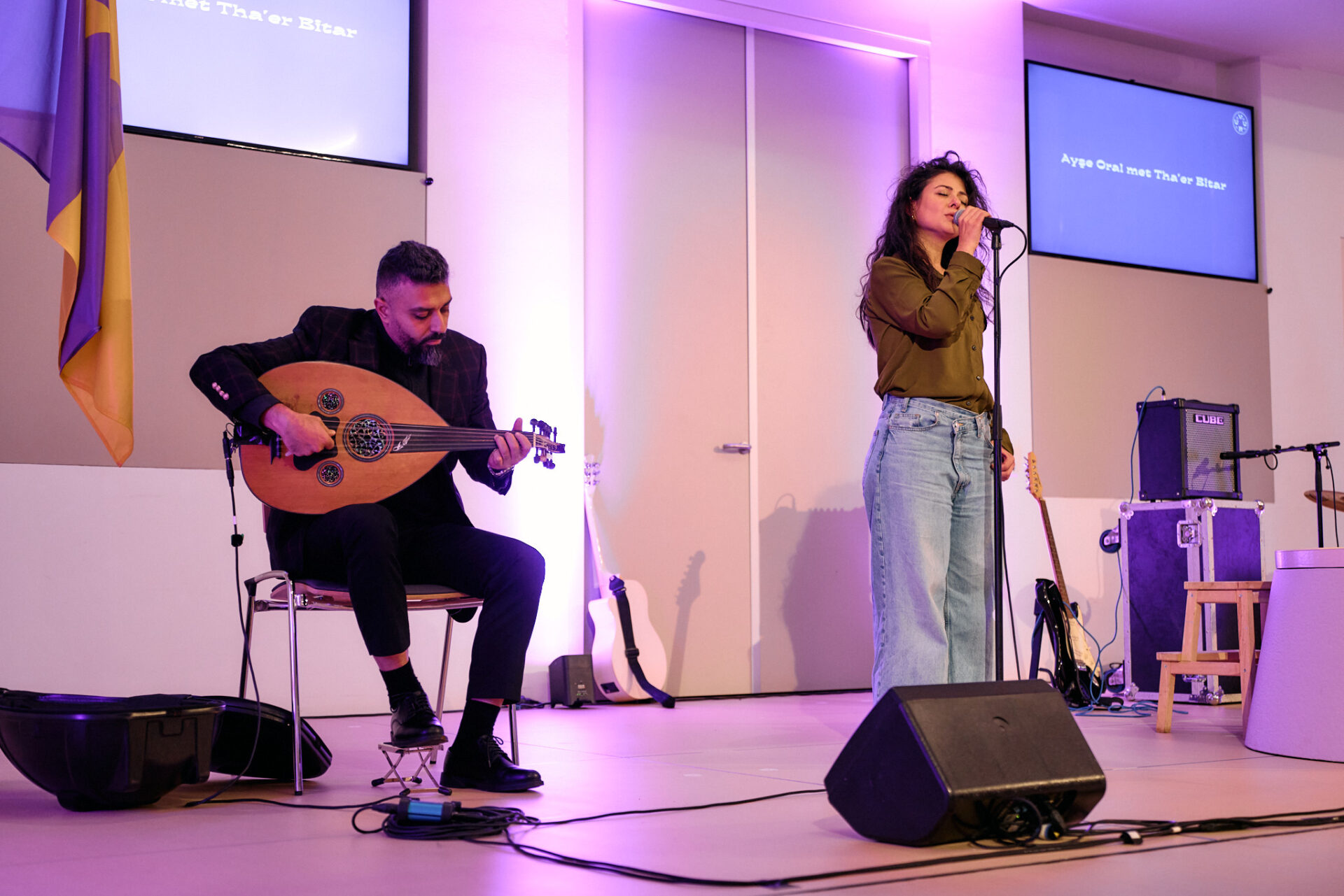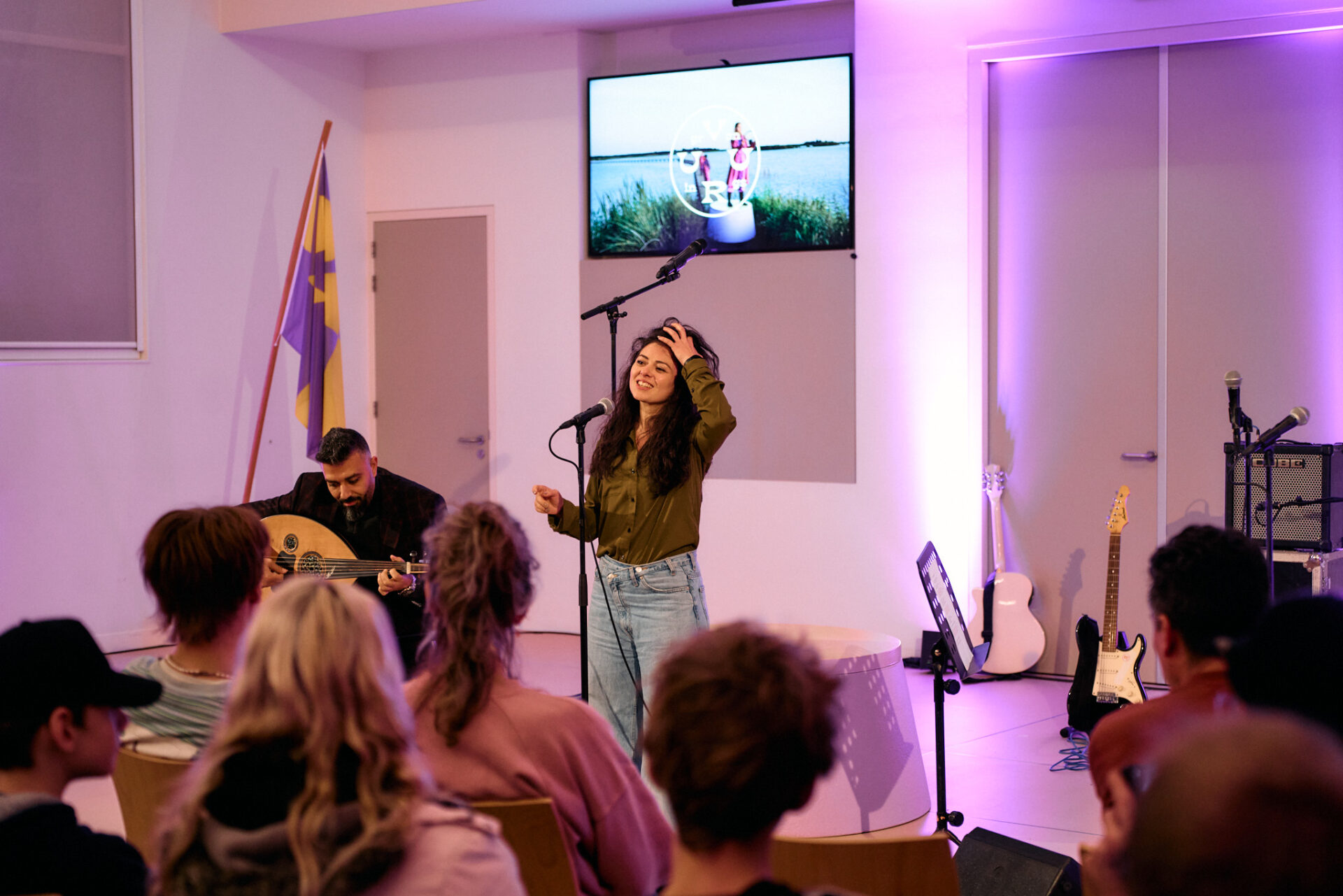 Een volgende muzikale bijdrage komt van actrice en zangeres Ayşe Oral. Zij komt uit Hoogezand en heeft Turkse roots. Dat is de taal waarin ze zingt, onder muzikale begeleiding van Tha’er Bitar. ,,Ik kom net van een koud optreden, dus een Kampvuur is geen overbodige luxe”, grapt ze.