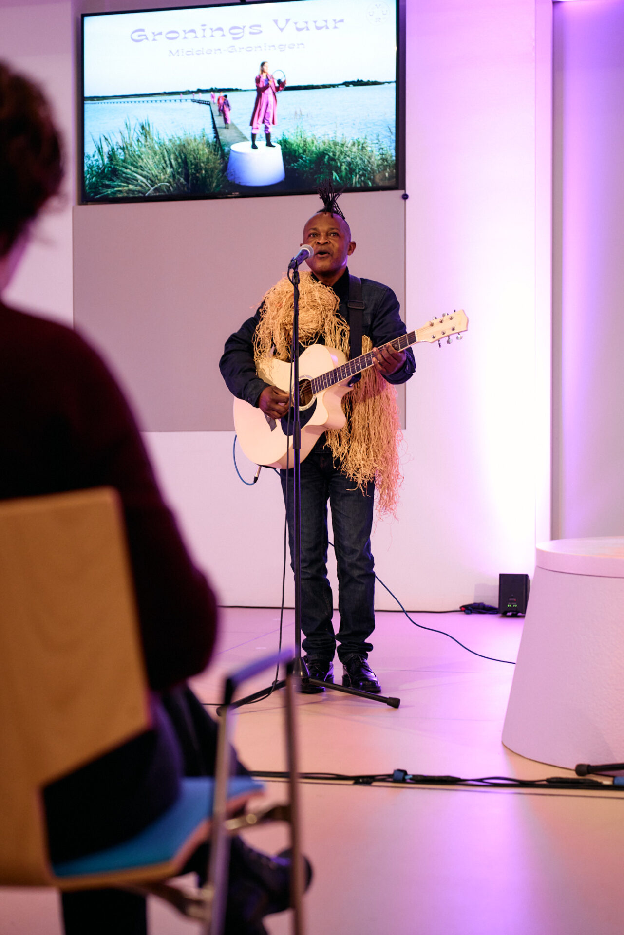 Terug naar het begin van Kampvuur. De Congolese muzikant Makila Kibas Besi – hij kwam 8 jaar geleden naar Nederland – opent de avond. Een vrije vertaling van de titel van het lied dat hij speelt: ‘Welkom, hallo allen’. Een toepasselijke start.