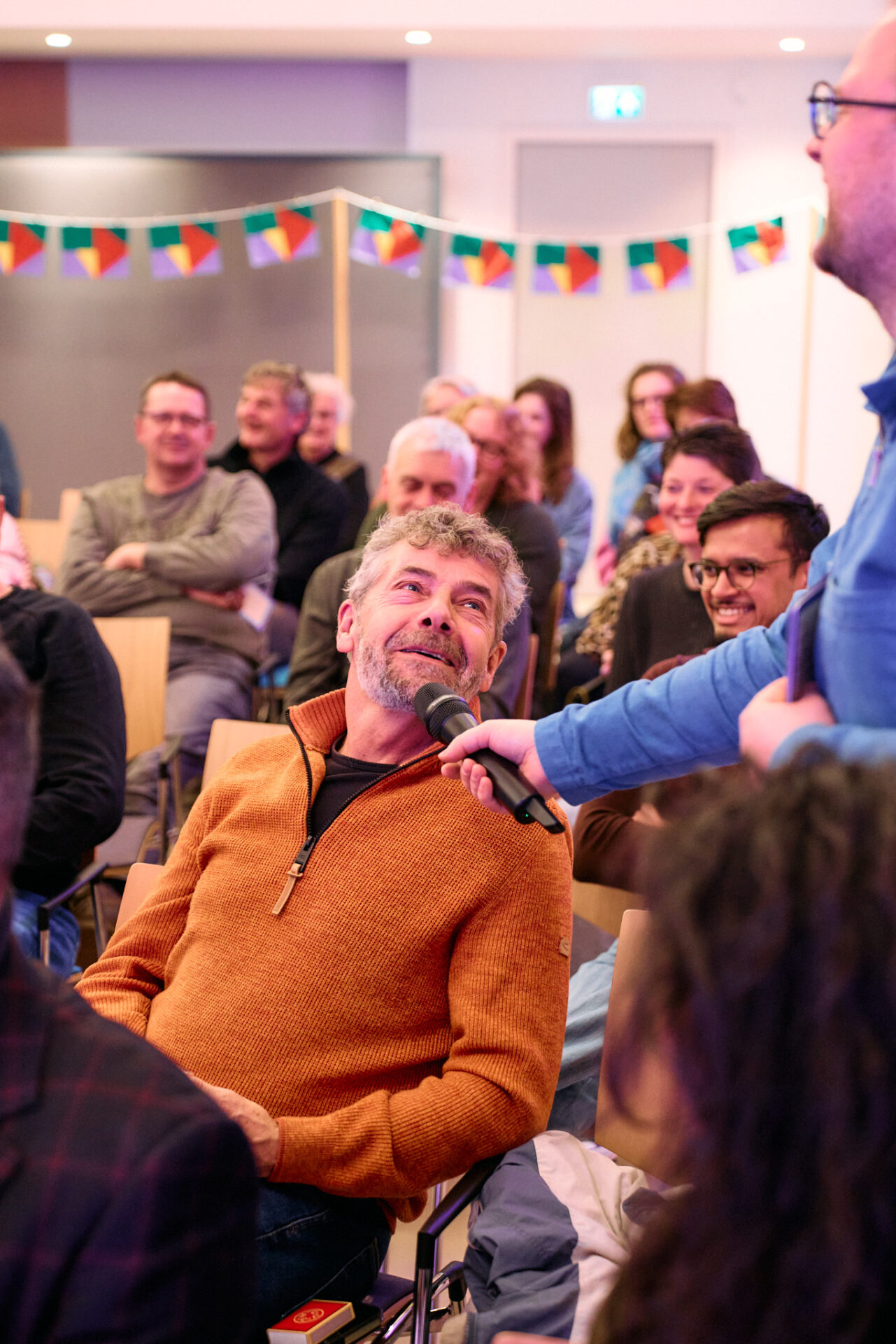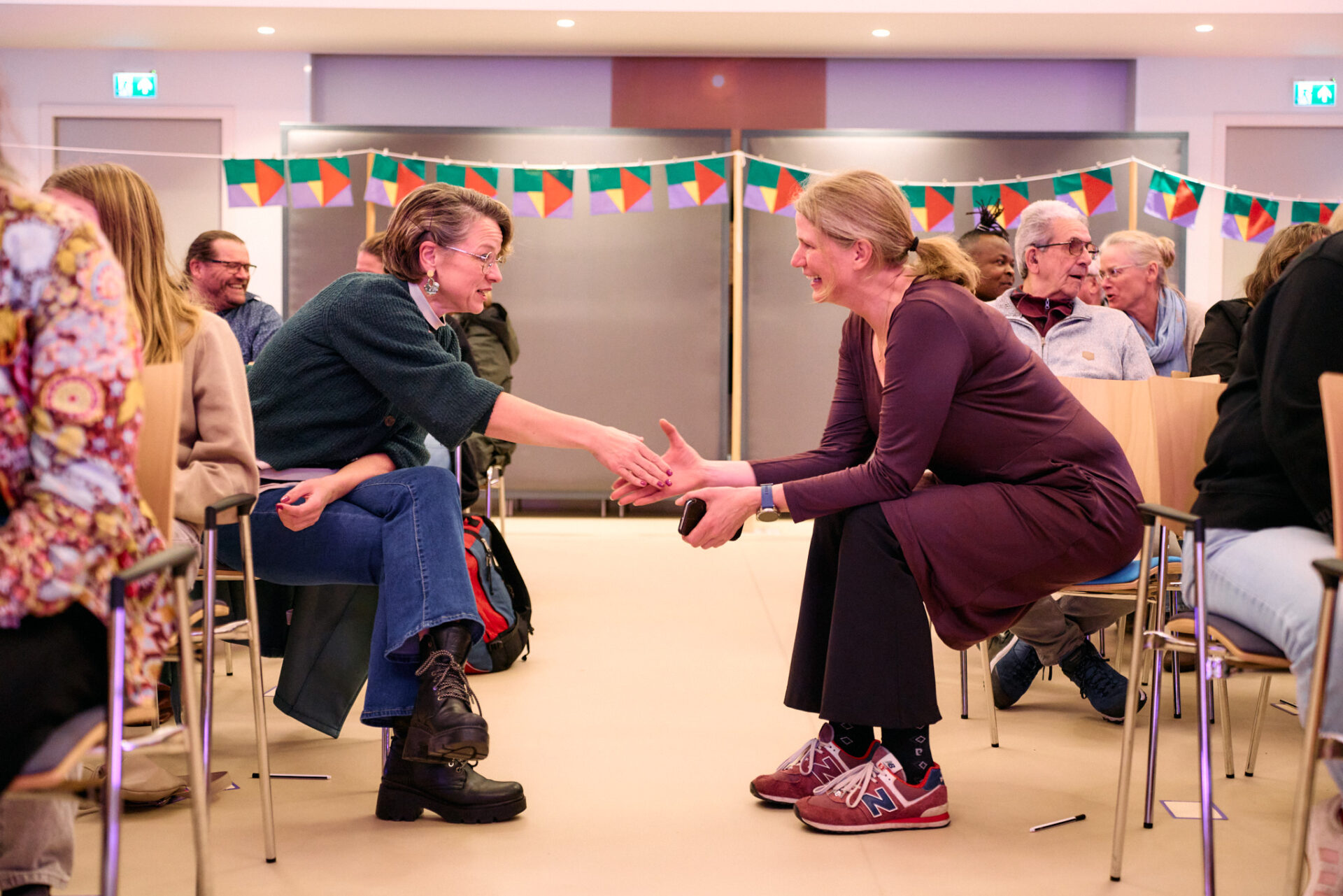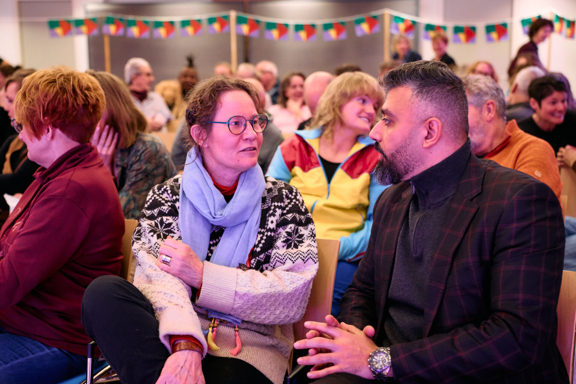 ,,Wat heb je nodig om een ander te ontmoeten”, vraagt ze vervolgens aan de zaal. Die mogen in een minuut een antwoord vormen met een buurman of -vrouw uit het publiek. ,,Een open houding. De bereidheid om te willen praten”, volgt als reactie. En ook: ,,Tijd hebben voor elkaar.” ,,Minder de kat uit te boom kijken”, komt nog naar voren. En ,,Als twee mensen dat doen, blijft ‘ie zitten.”