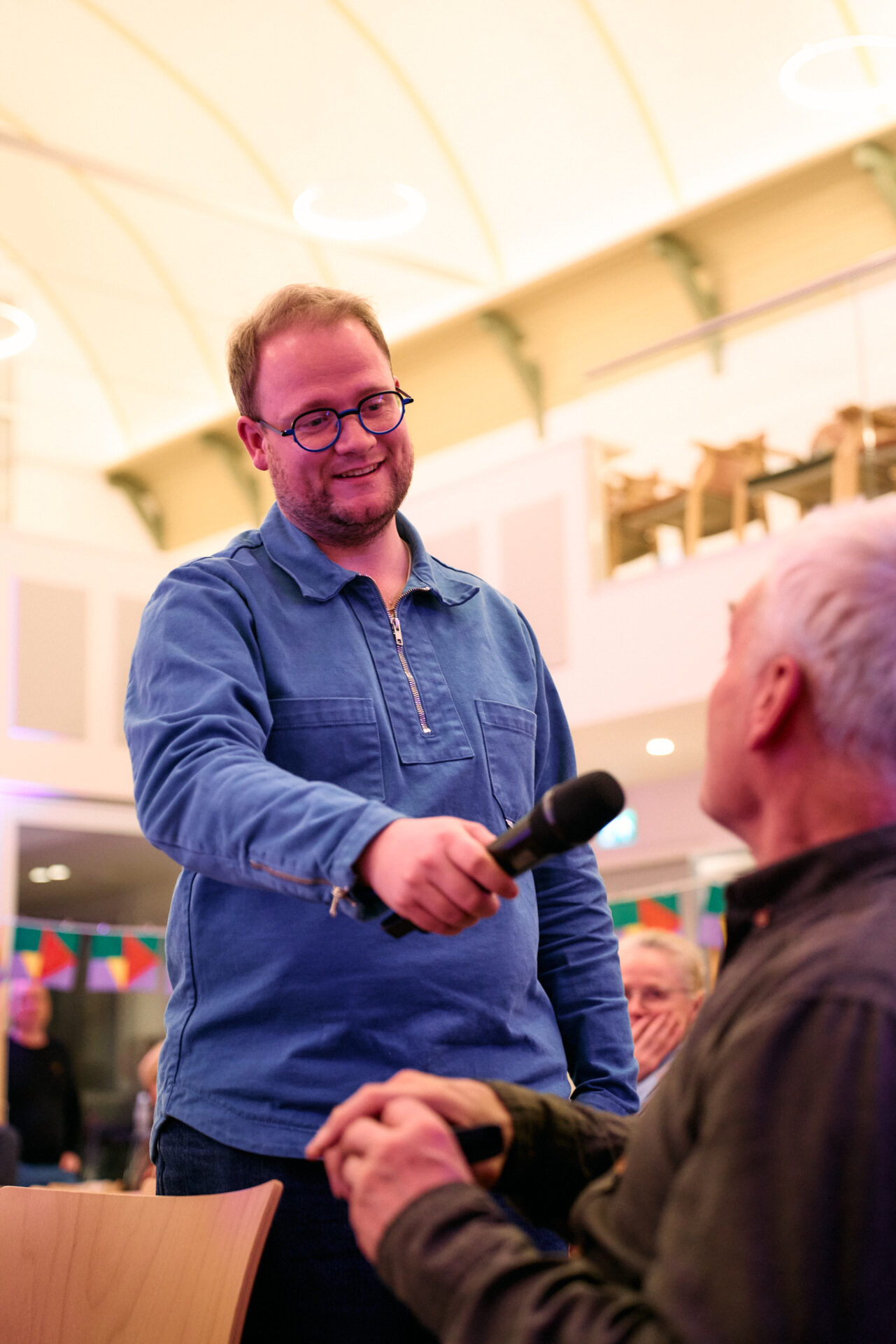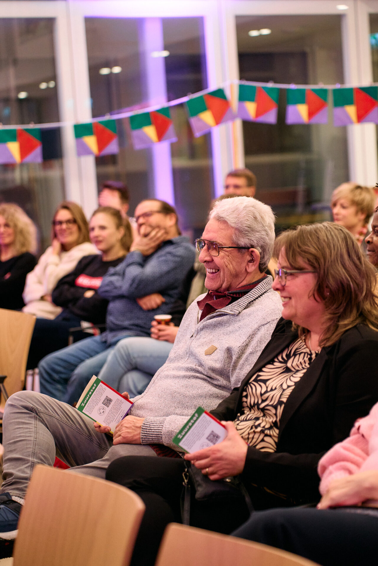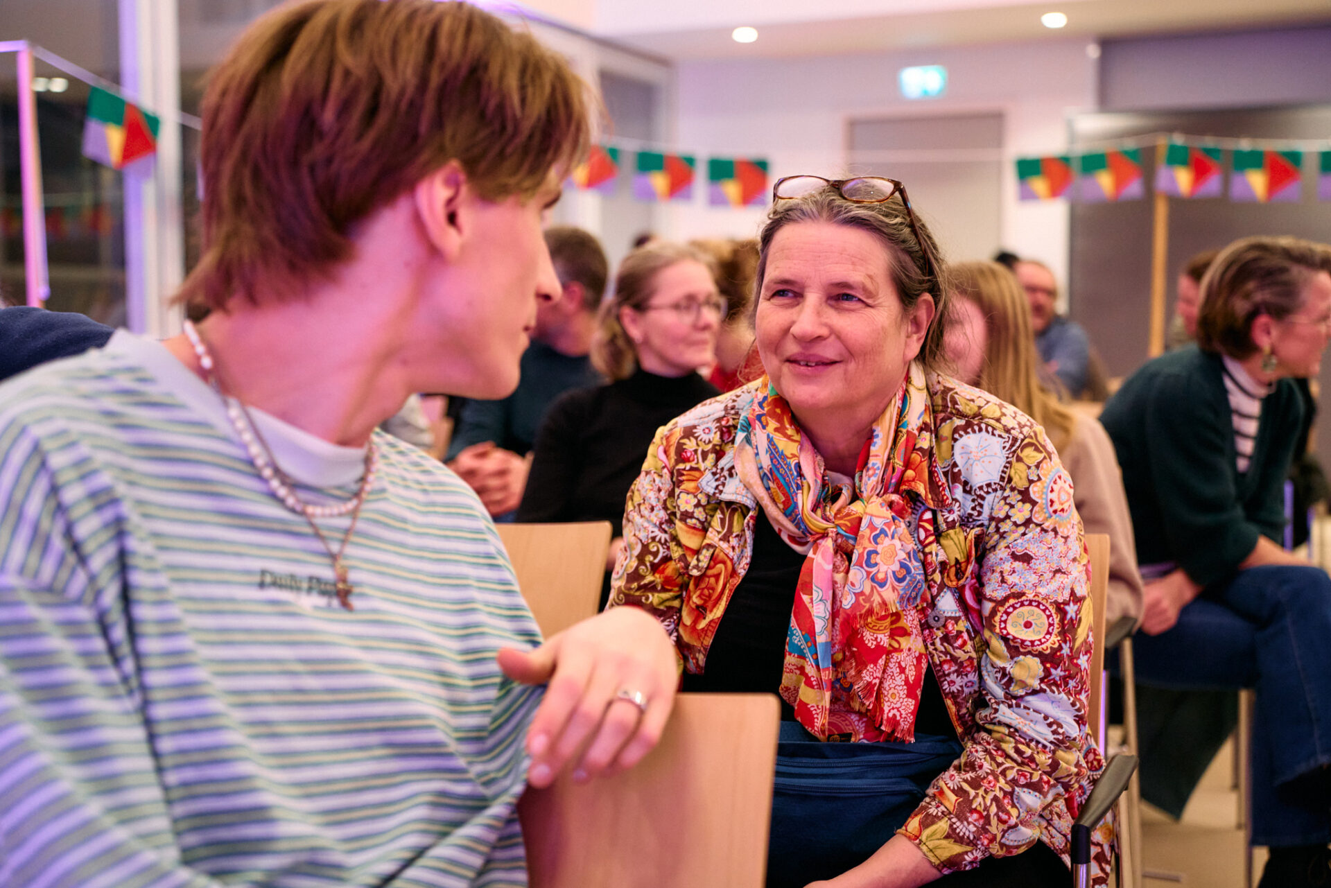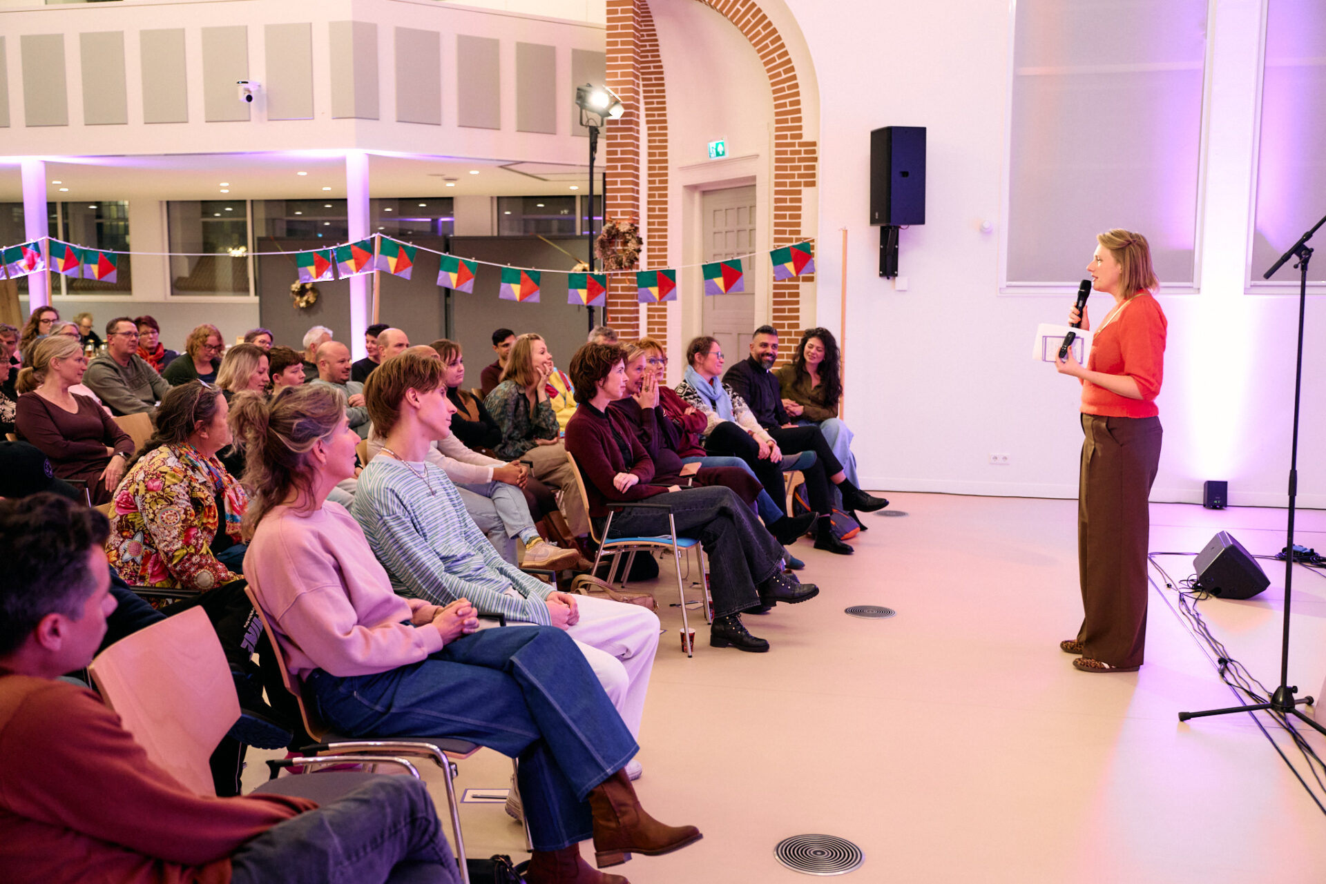 ,,Wat heb je nodig om een ander te ontmoeten”, vraagt ze vervolgens aan de zaal. Die mogen in een minuut een antwoord vormen met een buurman of -vrouw uit het publiek. ,,Een open houding. De bereidheid om te willen praten”, volgt als reactie. En ook: ,,Tijd hebben voor elkaar.” ,,Minder de kat uit te boom kijken”, komt nog naar voren. En ,,Als twee mensen dat doen, blijft ‘ie zitten.”