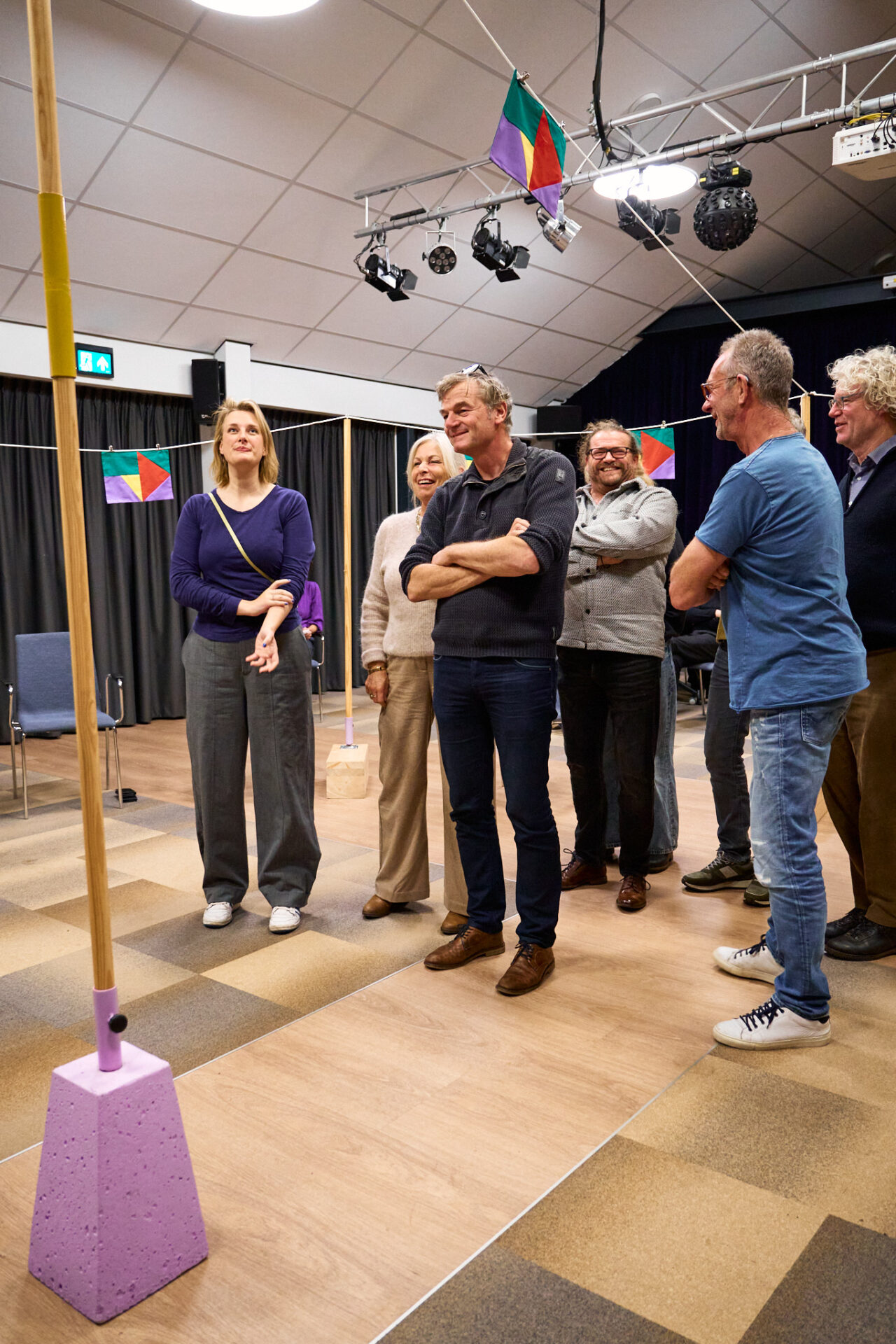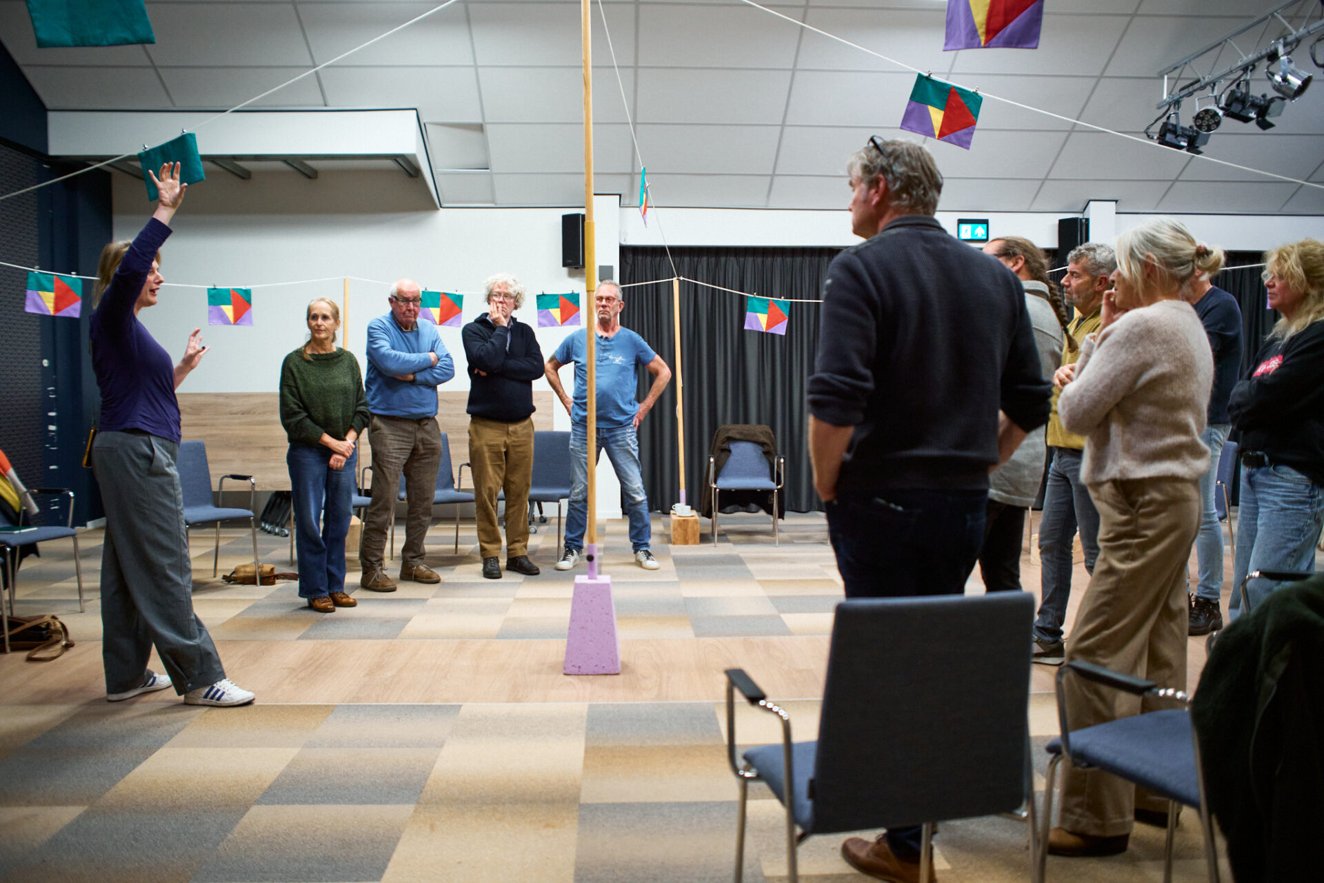 Hierna vraagt Sara om de stoelen aan de kant te zetten en te gaan staan in een kring. ,,We gaan niet alleen vertellen wat we denken over de leefbaarheid en klimaatverandering in Midden-Groningen, maar dit ook laten zien. Dit doen we door te laten zien waar we staan ten opzichte van de stelling. Ik zal steeds je stelling herhalen, en wat versterken, zodat het een duidelijk standpunt is. Daarna nodig ik steeds iedereen uit om erachter, er recht tegenover, of juist ergens er tussenin te gaan staan. Het kan zijn dat je letterlijk van standpunt verandert. Dat is helemaal goed!”