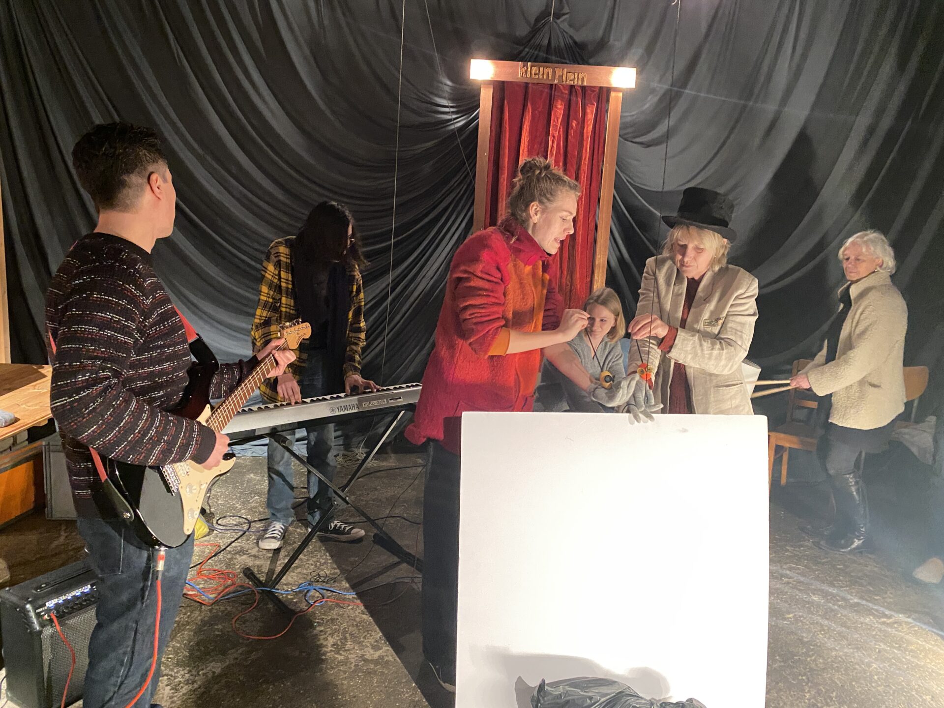 Wat volgt is een poppenspel, begeleid door vrolijke muziek. Hiervoor worden niet alleen instrumenten gebruikt zoals gitaar en piano, maar ook een zelfgemaakt instrument, een soort orgel. De twee poppen beelden een hobbelige reis uit, met van alles in de knapzak die meegedragen wordt. Onderweg wordt het afval weggegooid. Welke dingen neem je mee, verplaats je of gooi je weg? Aan het einde van de reis volgt utopia: in het licht, waar het fijn en goed is. Het uitgangspunt voor deze pitch was ‘hoe ziet het openbaar vervoer eruit zonder asfalt?’
