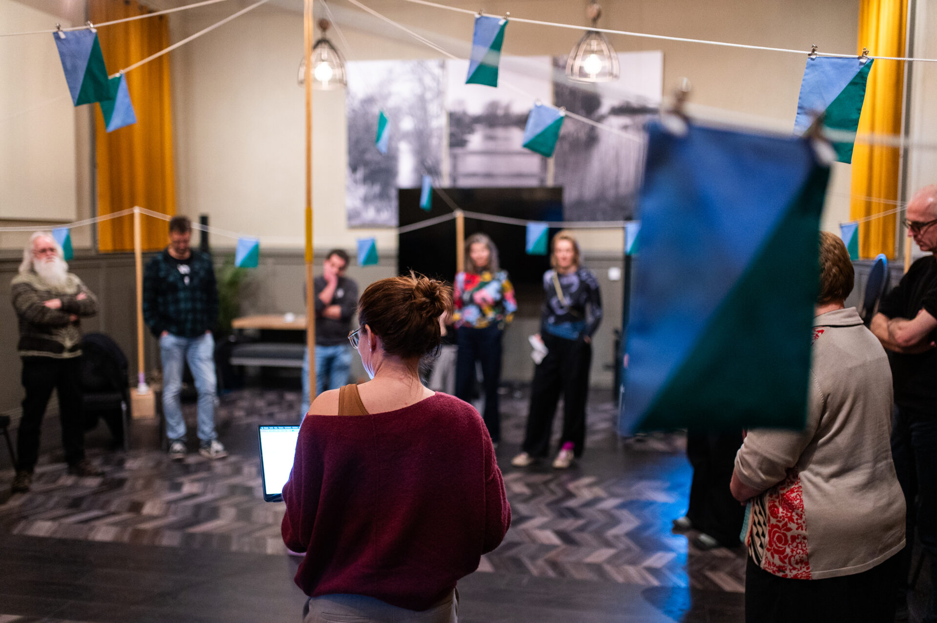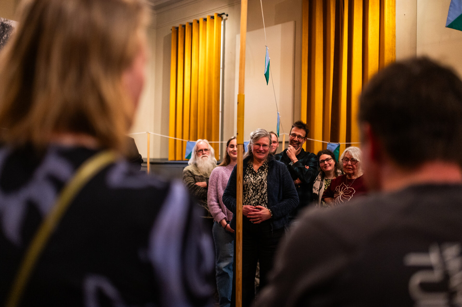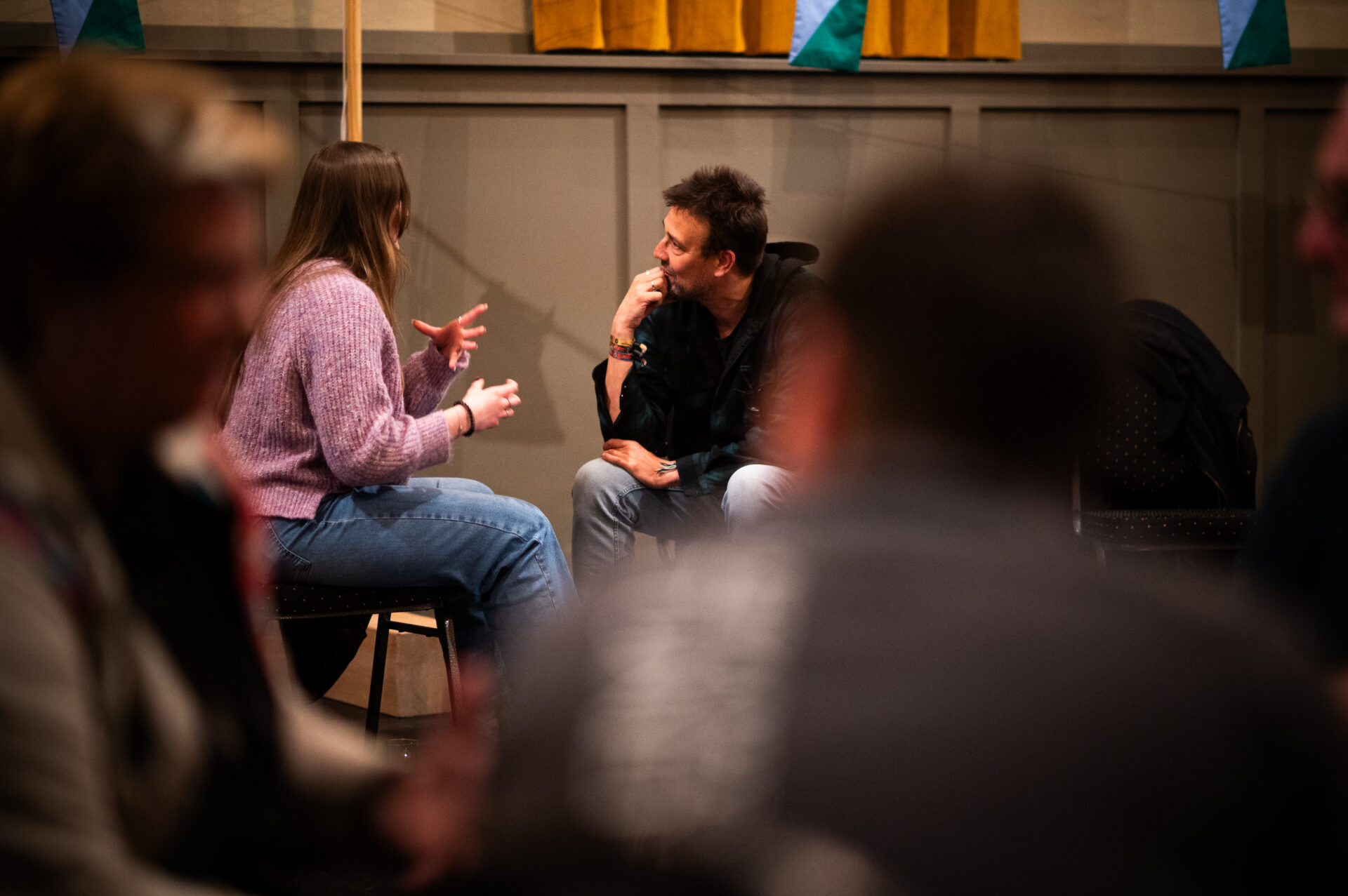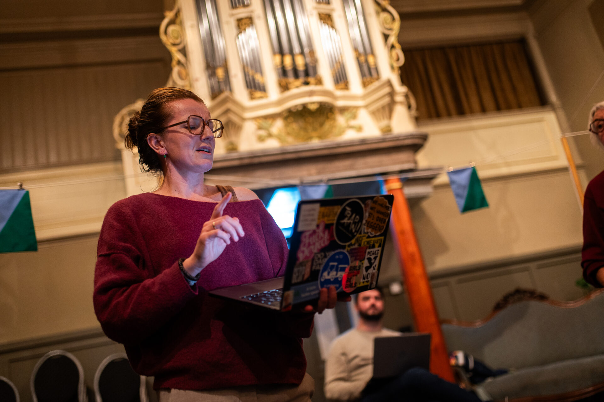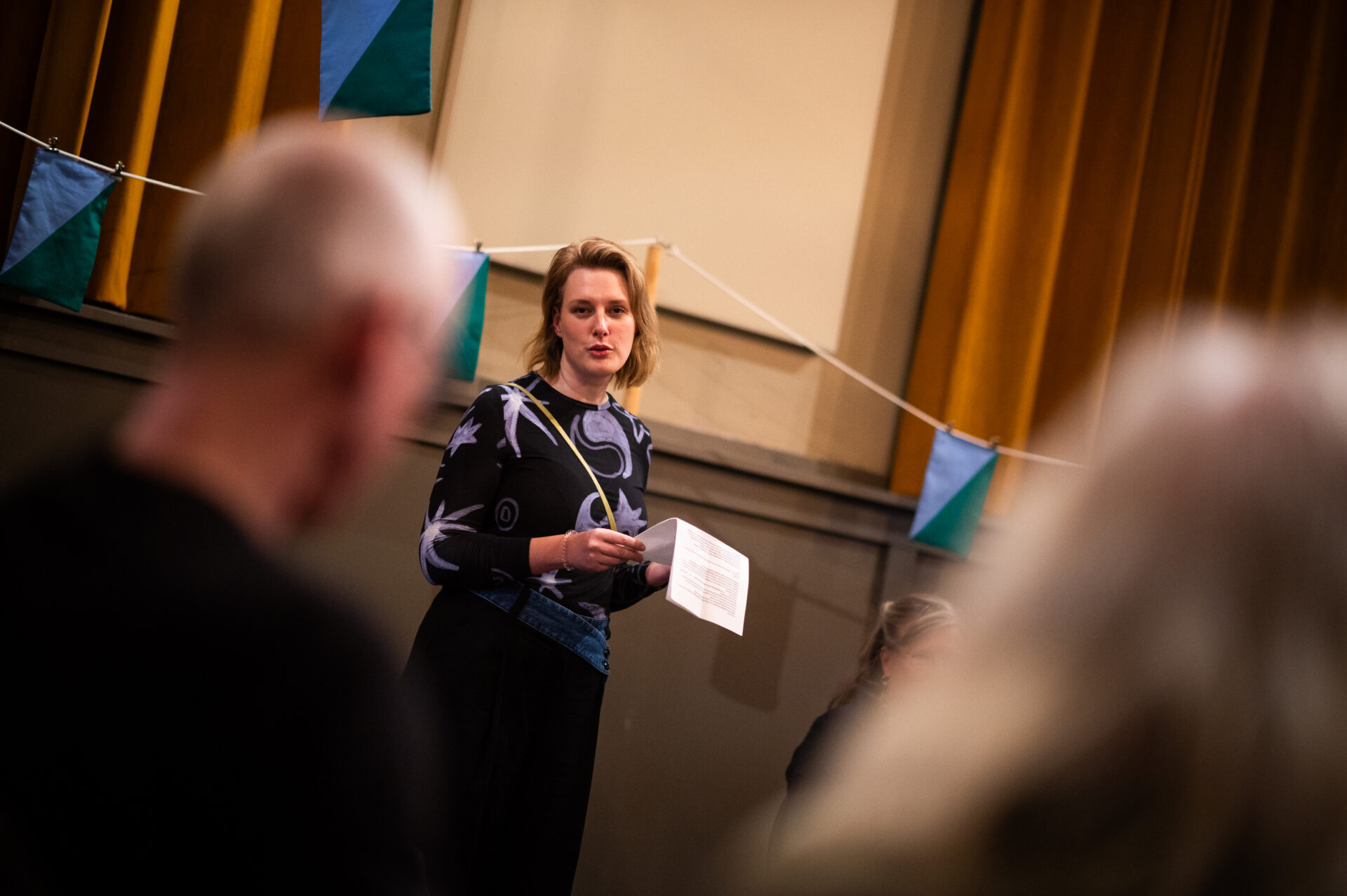 Sara Scholten opent de avond namens Gronings Vuur. ,,We halen vanavond meningen op en reflecteren op datgene wat wordt uitgesproken. We gaan het hebben over de leefomgeving, hoe het is om hier te leven, wonen en te werken. Over klimaatverandering en de toekomst.”